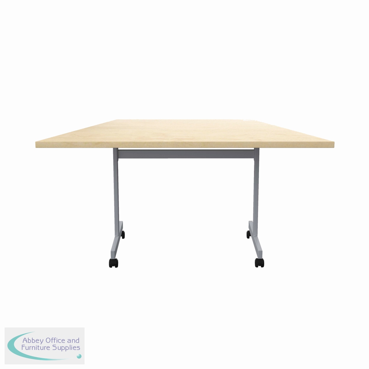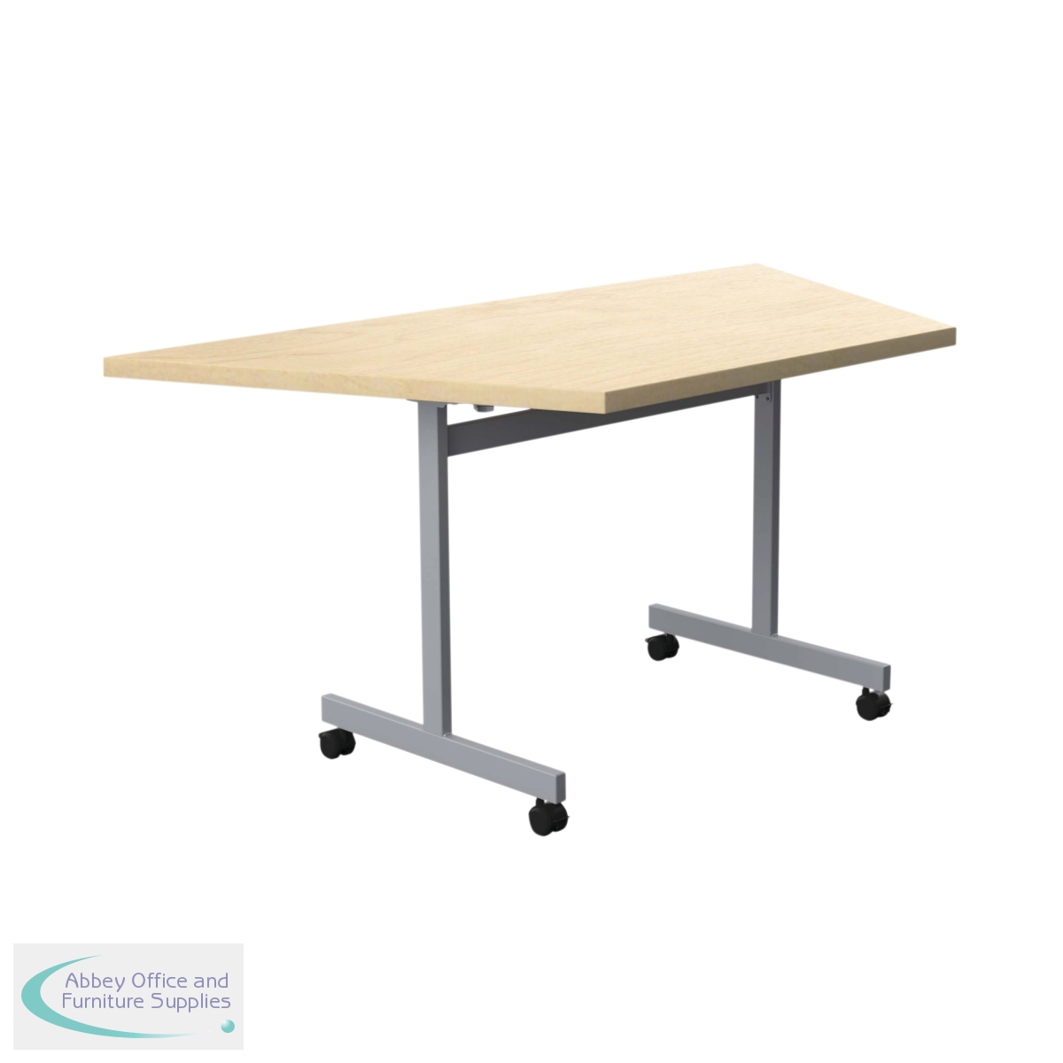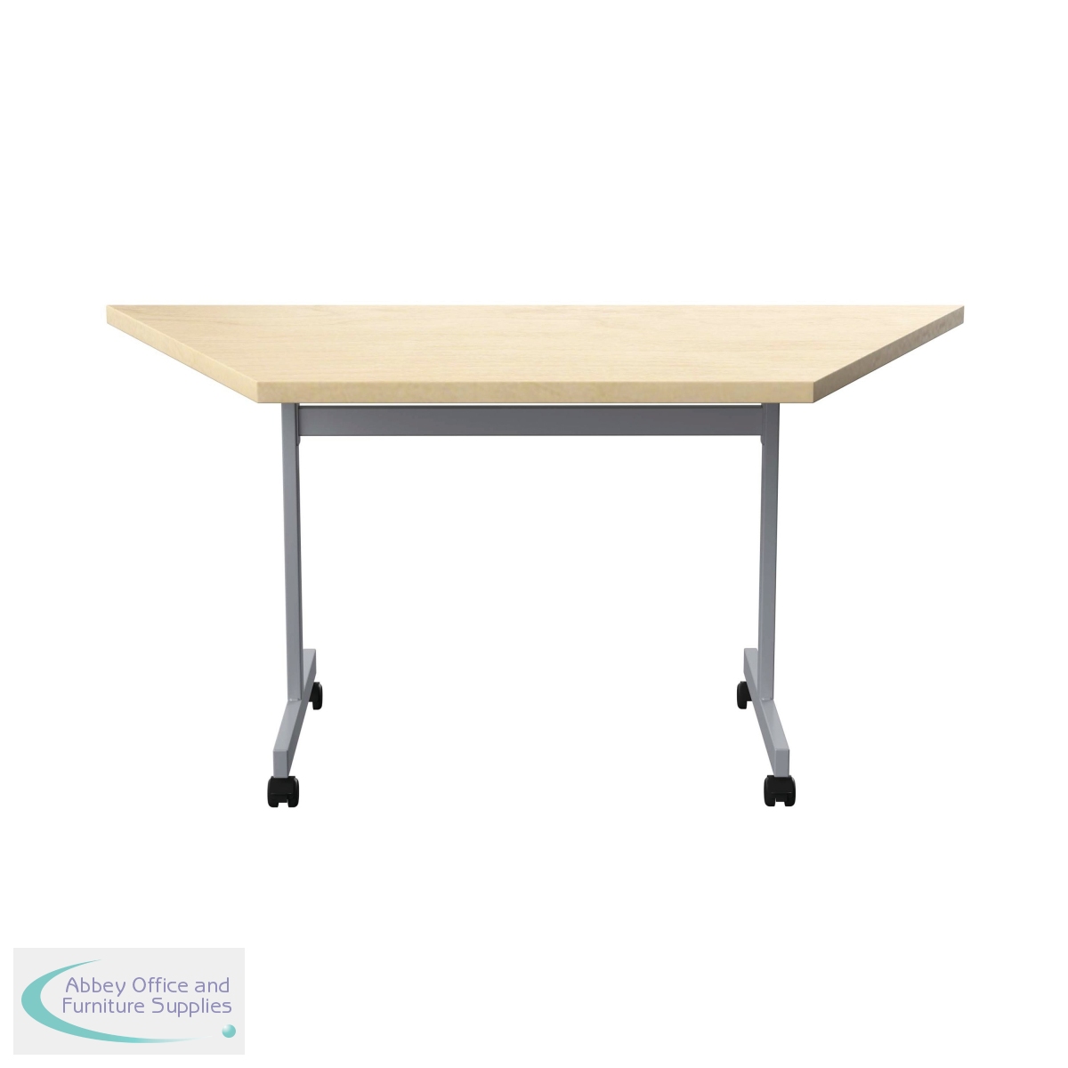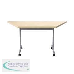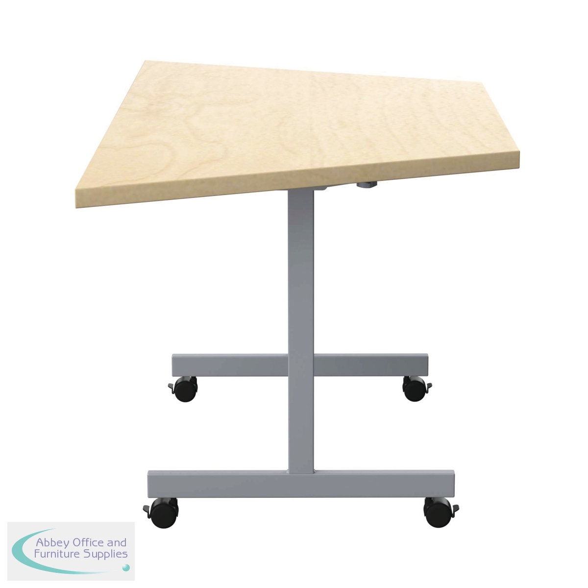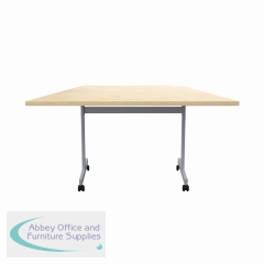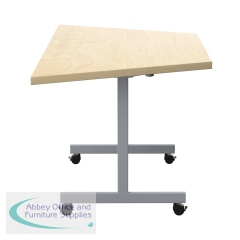 This economical mobile flip-top table has a hard-wearing MFC trapezoidal top and silver legs with black castors.