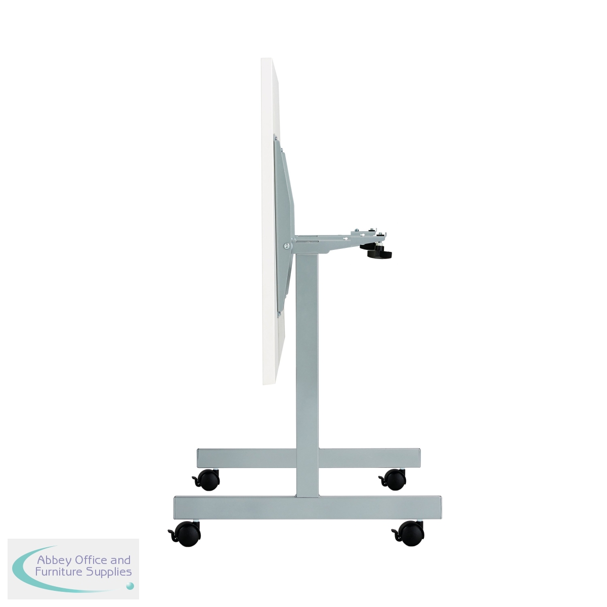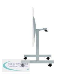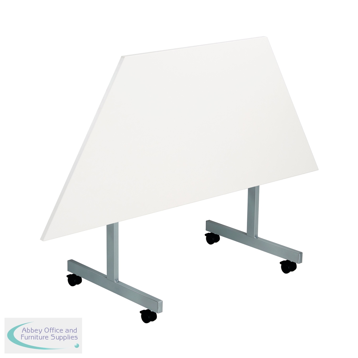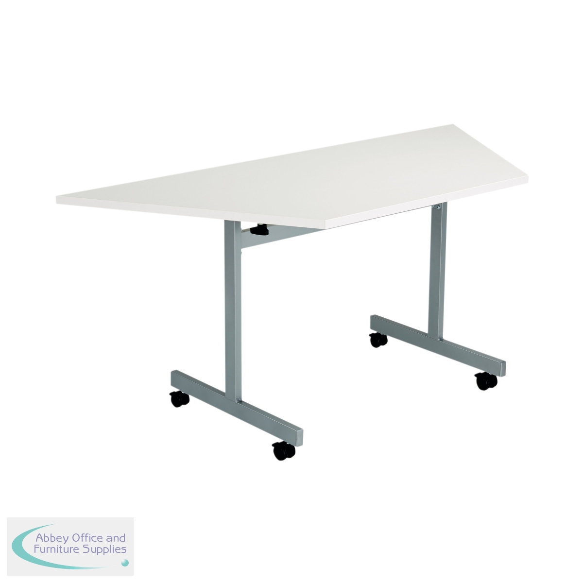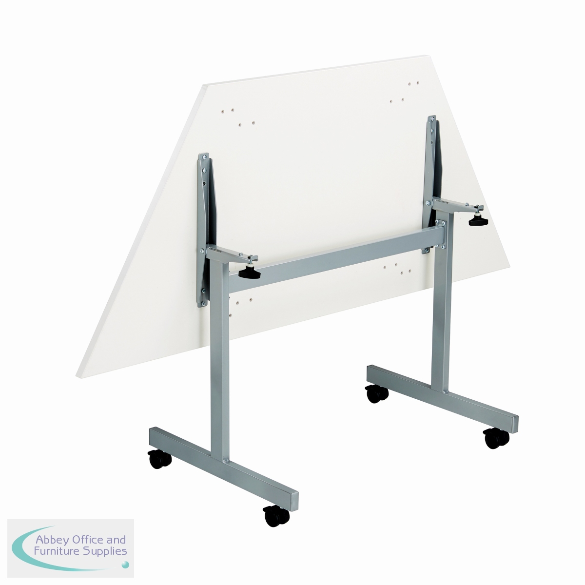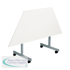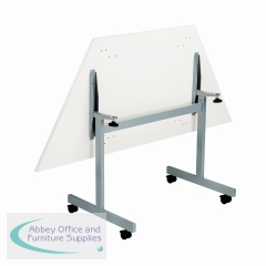This economical mobile flip-top table has a hard-wearing MFC trapezoidal top and silver legs with black castors.