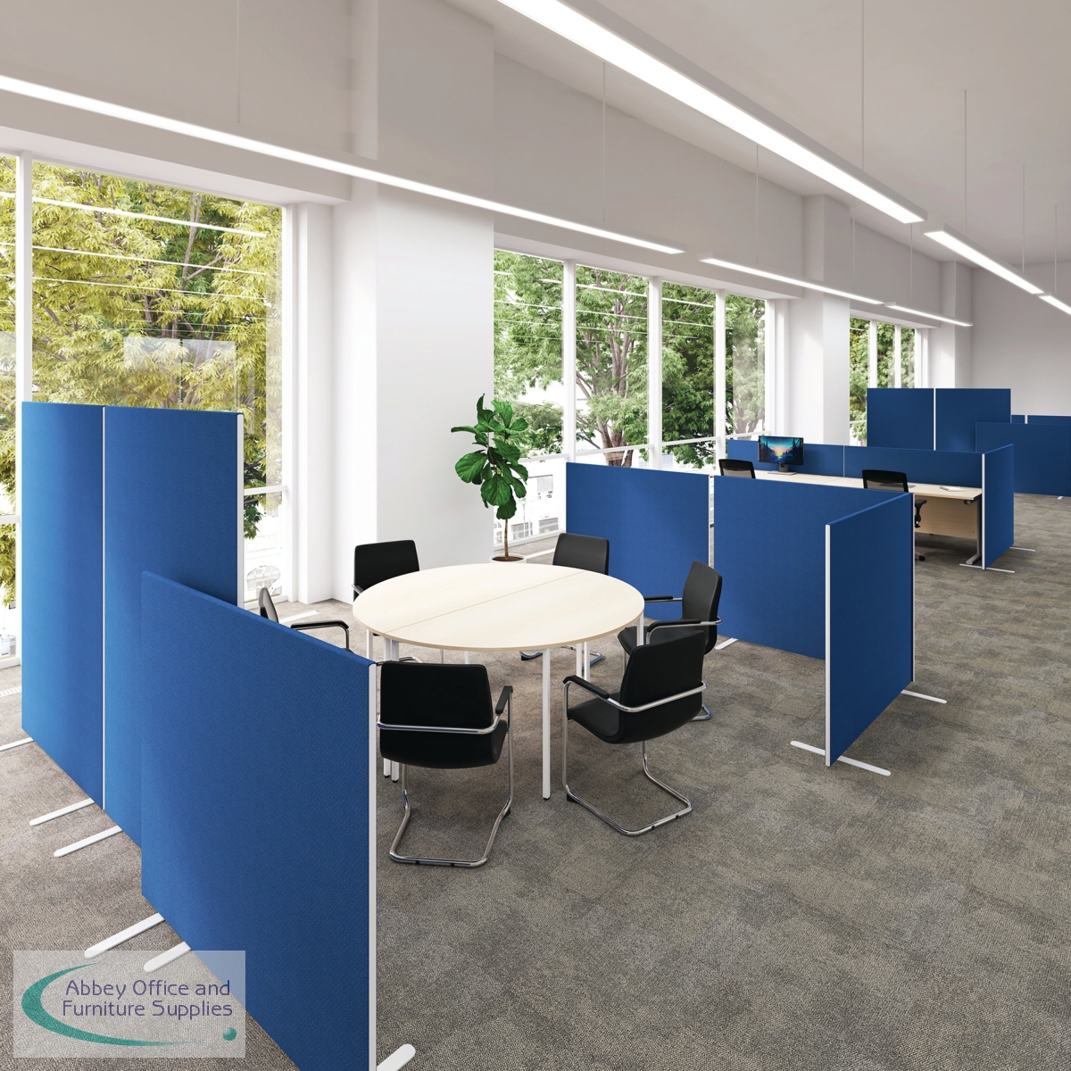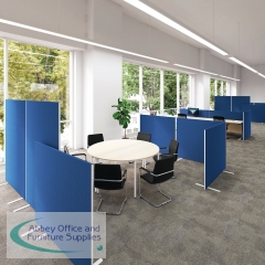 This upholstered floor standing screen is designed to be durable and economic. It is black with a white trim. It measures W1400 x H1200mm.