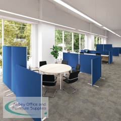This upholstered floor standing screen is designed to be durable and economic. It is blue with a white trim. It measures W1400 x H1600mm.