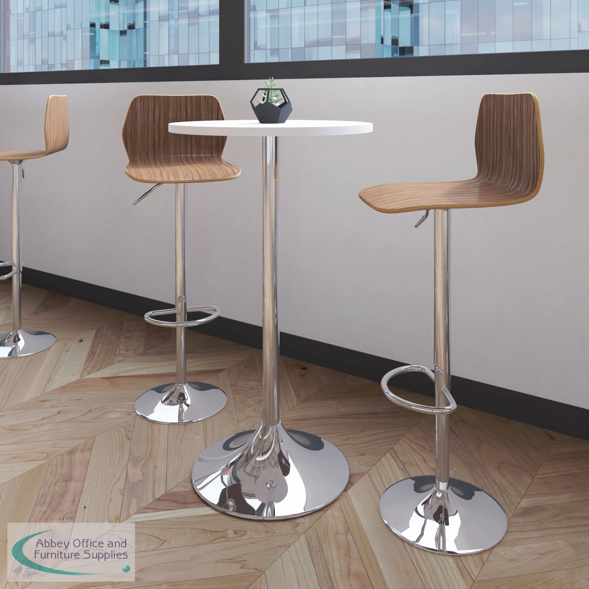 This wood veneer high stool is ideal for use in bistros, cafes and break-out areas. It has a chrome stand and foot ring with height adjustable gas stem, with a fixed back. Comes with a 5-year guarantee.
