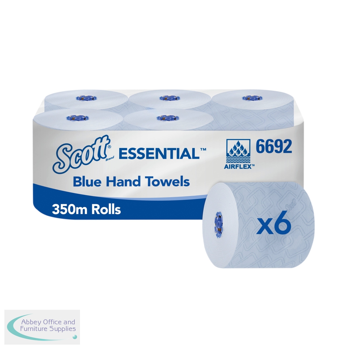 Scott Essential Rolled Paper Hand Towels are efficient and reliable hand towels for everyday hand drying. They are ideal for use in high-traffic environments (e.g. food service or airports) where efficiency is critical. The unique Airflex Technology ensures each towel is ultra-absorbent compared to conventional paper towels. The fabric remains strong when wet, preventing it from ripping, whilst retaining its soft and comforting texture. These hand towels carry the European Ecolabel for responsible manufacturing and each sheet is 198mm wide. This pack contains six 350m blue rolls, which equates to 8,400 individual sheets.