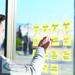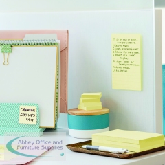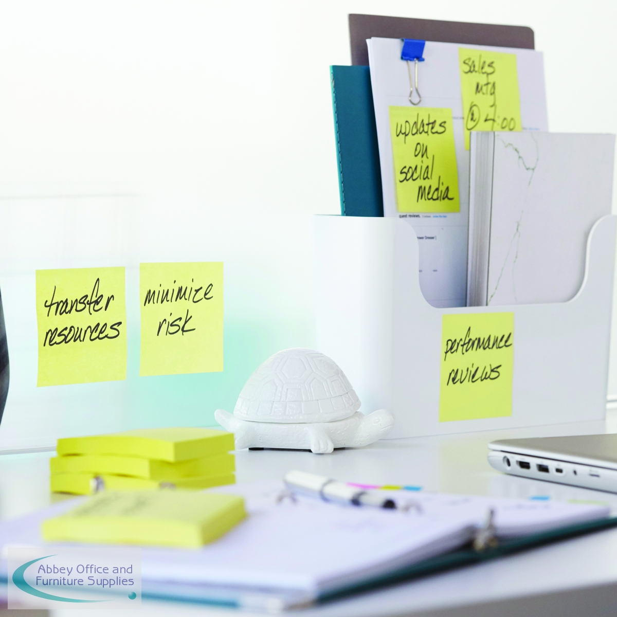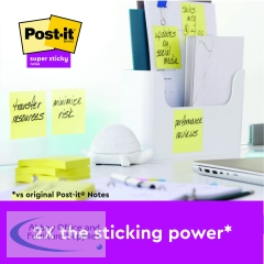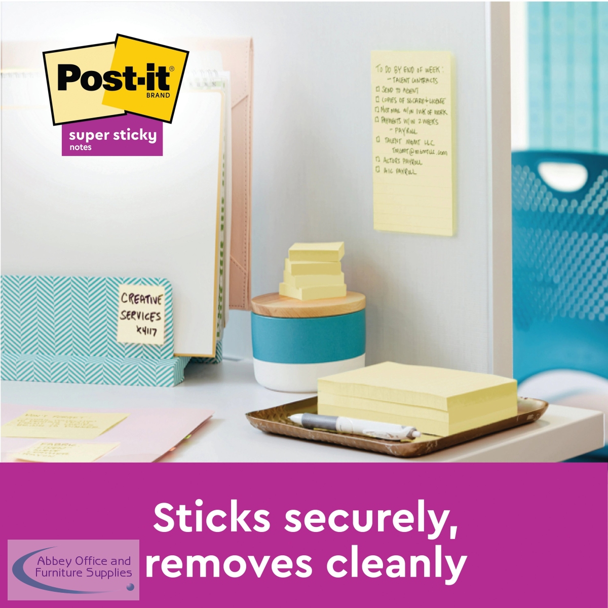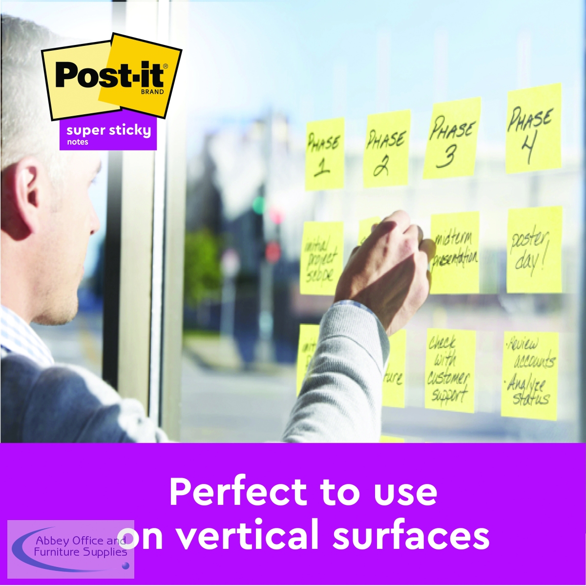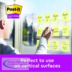 Make sure your message sticks with Post-it Super Sticky notes. 76 x 76mm sheets, Ideal for desktop use. These repositionable notes feature a strong adhesive that will adhere to most surfaces, including doors, walls and windows. Perfect for making notes or leaving messages and reminders. Made from 100% PEFC certified paper fibre. This cabinet pack contains 24 pads in classic canary yellow.