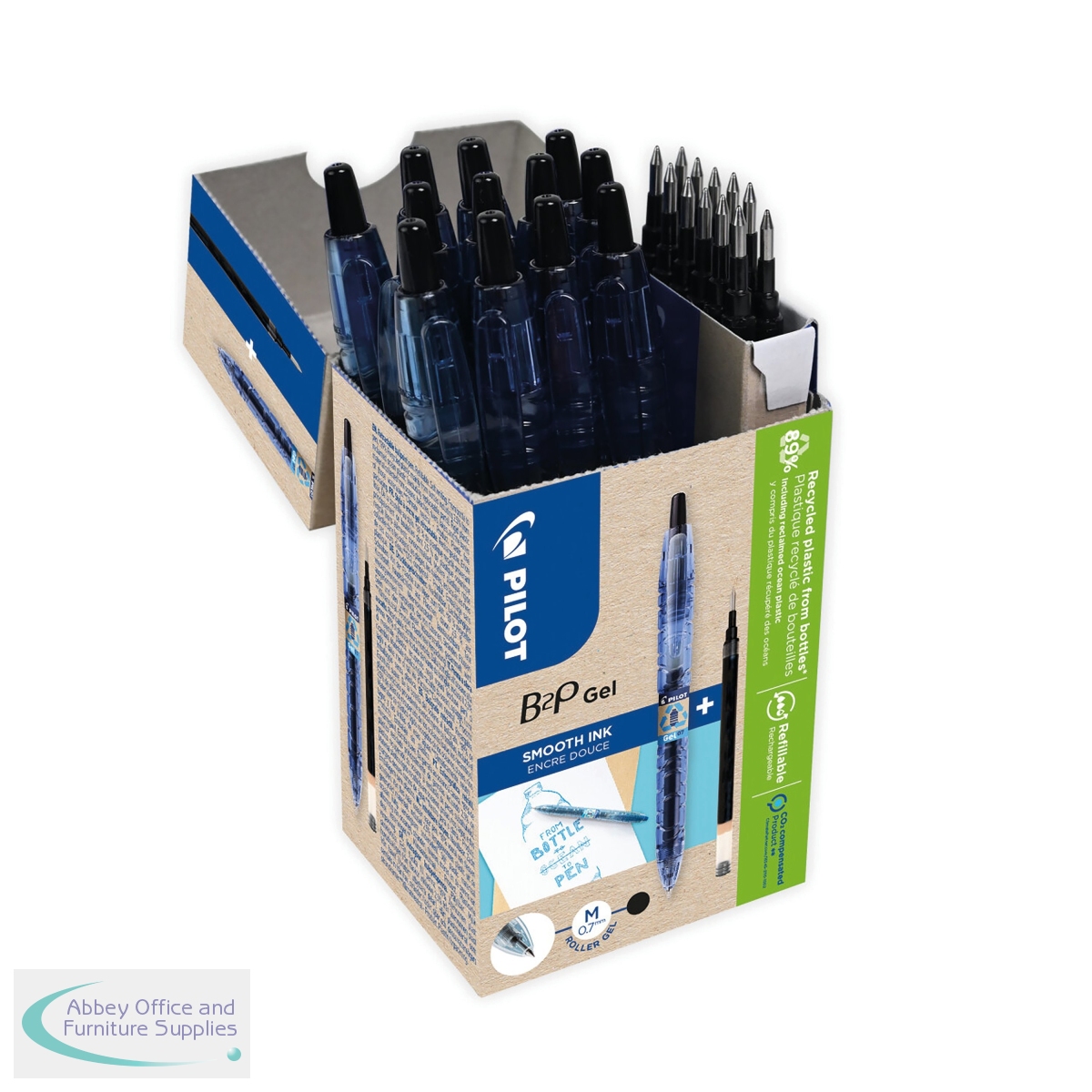 This pack includes 10 Pilot B2P Gel Ink Rollerball Pens and 10 refills. The smooth-writing gel ink gives a writing experience that glides across the page. To help you do your bit for the planet, these pens are refillable and made with 89% recycled plastic components. The B2P GEL is made using PET plastic - the same plastic that goes into drinks bottles.