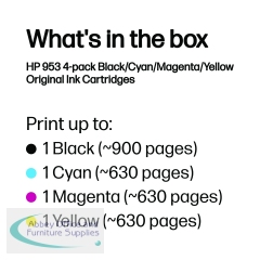 Reliable performance and professional quality printing. HP original ink cartridges give striking results each and every time. For vibrant colours and crisp black text in you HP printer. This cartridge has a yield of 900 pages black/630 page CMY.