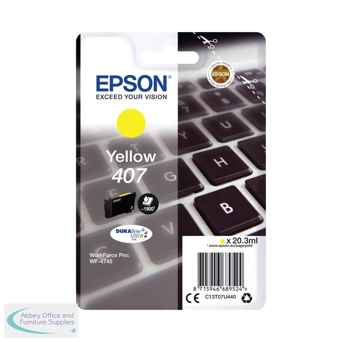 Epson DURABrite Ultra ink is a quick drying formula allowing documents and photos to be handled immediately after printing, Water, smudge and highlighter resistant so ideal for essential reports and archival documents. Each cartridge contains 20.3ml of yellow ink. With a print yield of up to 1,900 pages.