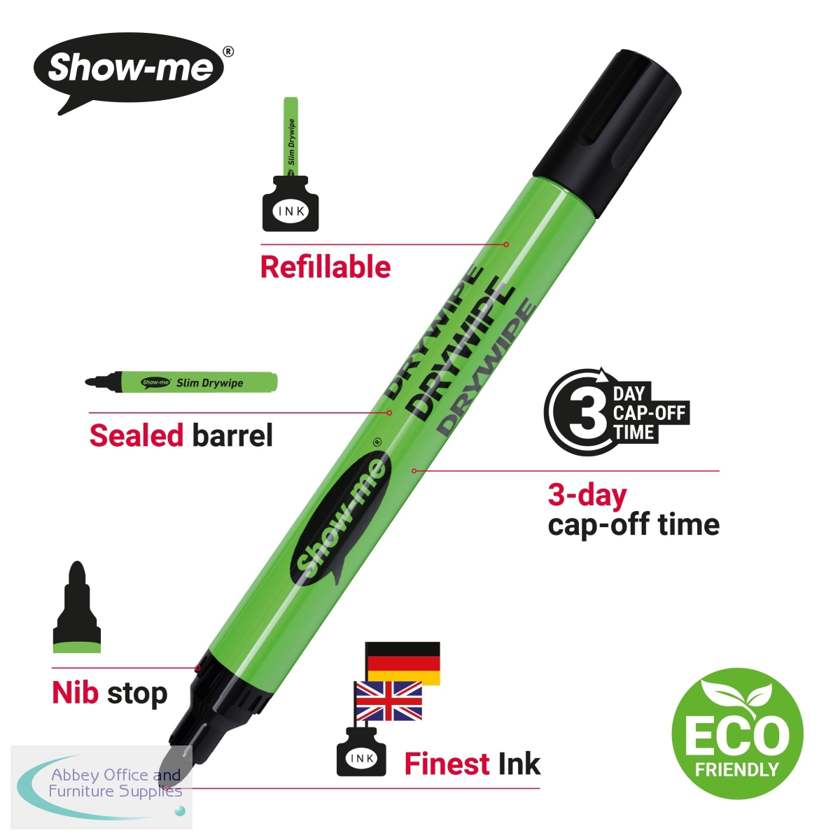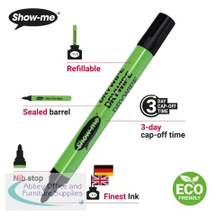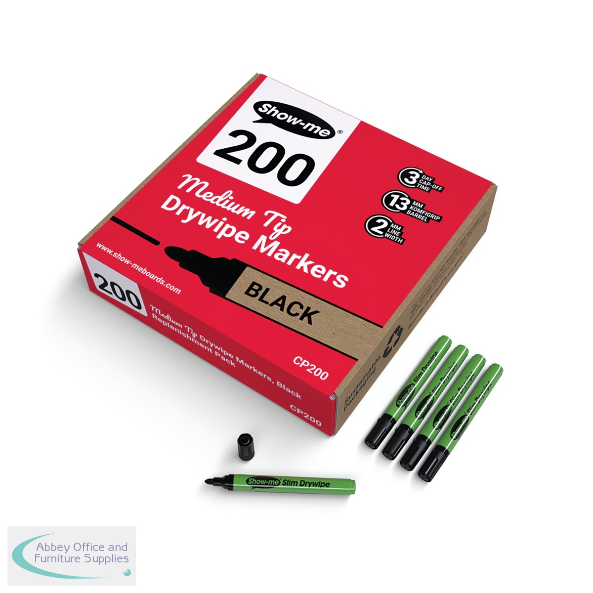 Show-me drywipe markers have been designed specifically for education, and they're trusted by thousands of schools around the globe. Each pen benefits from: a slim barrel with easy fit lid, an extra-hard nib that will not easily splay out, and nib-stop that prevents the tip from being pushed into the barrel. They're safety optimised with low odour, xylene-free ink, safety airflow caps, and boast a 72-hour cap-off time to prevent drying out. This pack contains 200 medium tip drywipe markers in black ink.