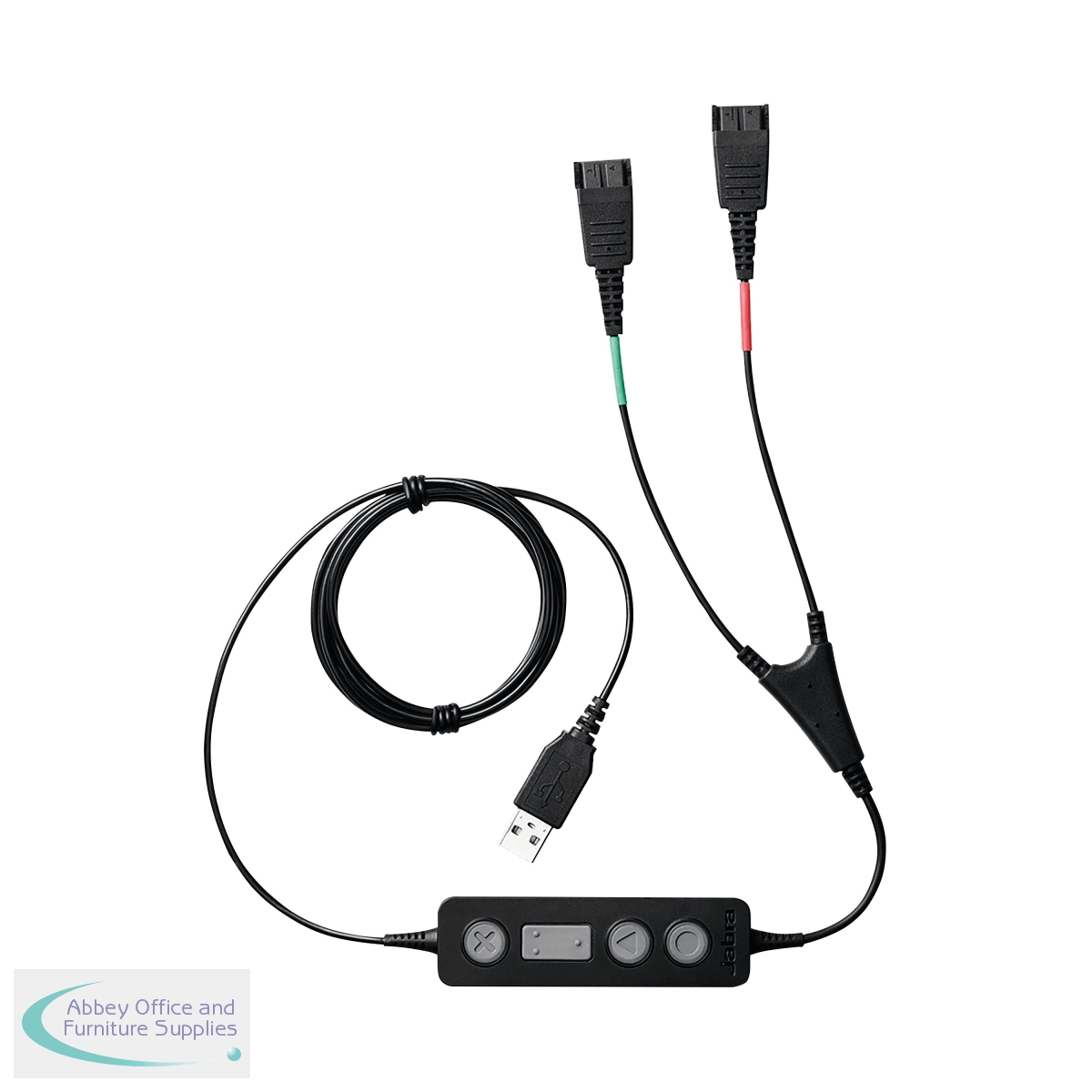 Jabra Link 265 USB/Quick Disconnect (QD) Y-training cable connects two Jabra Quick Disconnect (QD) headsets to one PC allowing supervisors to either stay muted or join the conversation.