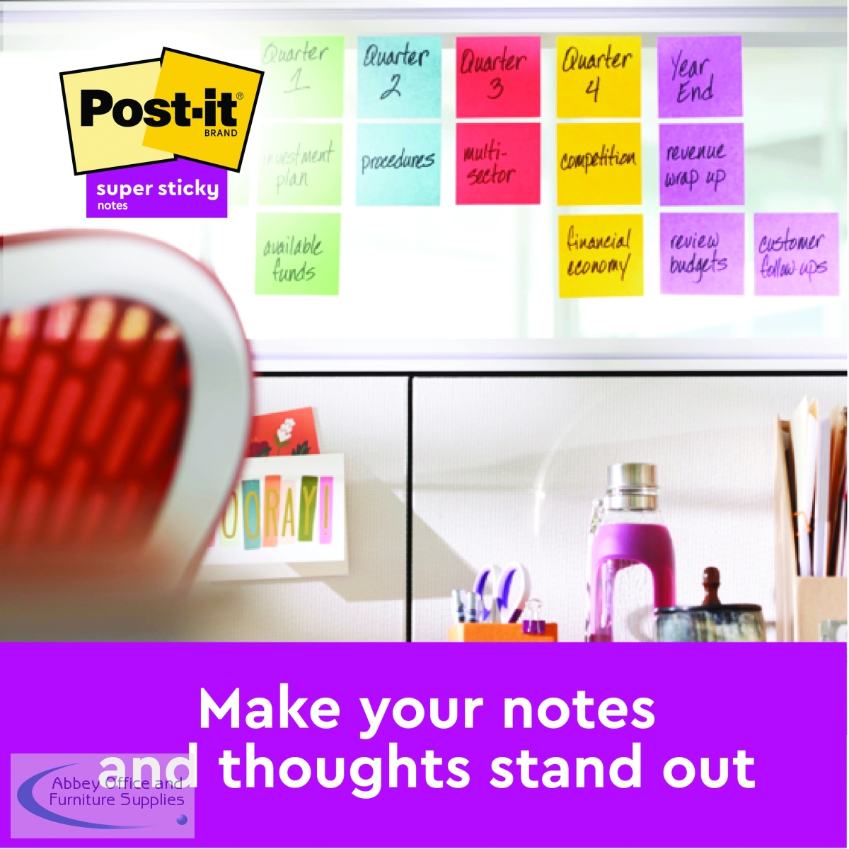 Ideal for desktop use, these repositionable Post-it Notes feature Super Sticky adhesive for a stronger, longer hold, which is perfect for important notes, messages and reminders. Each pad contains 90 sheets and measures 76 x 127mm. This Soulful colour collection contains 6 pads.