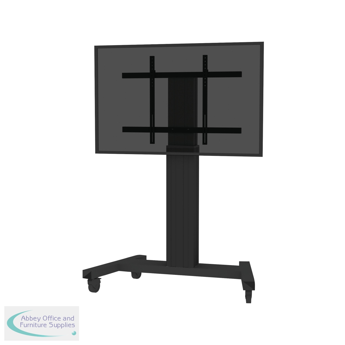 This motorised floor stand with tilt motion technology for up to 100 inch monitor screens features four solid castor wheels with two brakes. Supporting the weight of screens up to 130kg, this electric height adjustable mount is controlled via a remote control. Supplied in black.