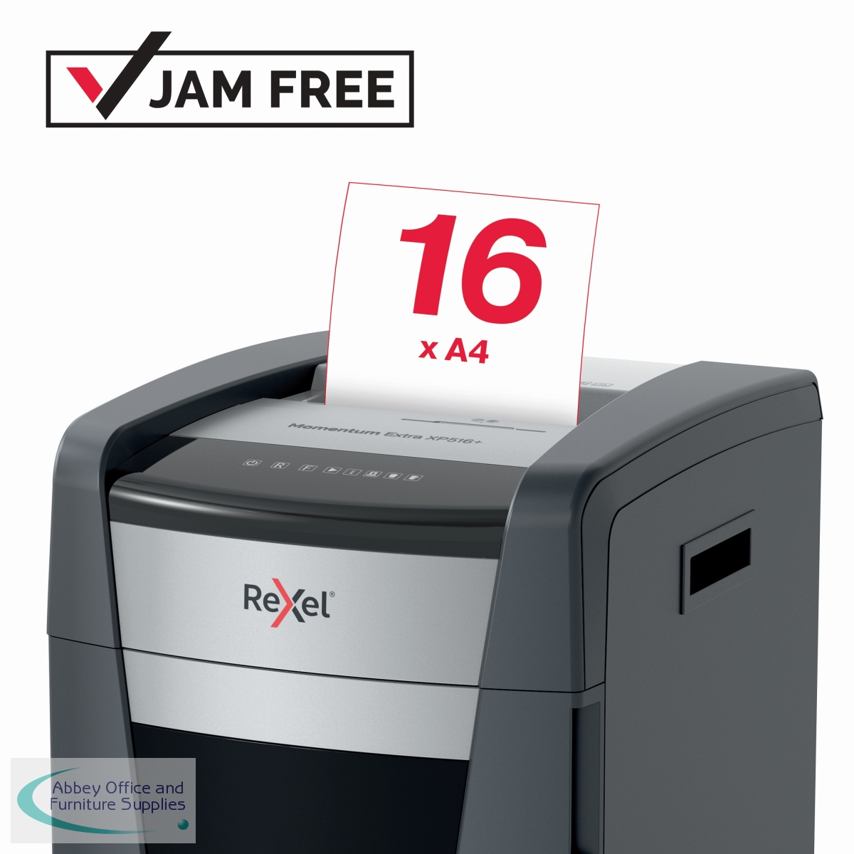 Rexel Momentum Extra jam free paper shredders are ideal for destroying confidential documents in the office. The XP516+ shredder machine shreds up to 16 sheets of A4 paper (80gsm) in one go through the manual feed slot into P-5 (2x15mm) cross-cut pieces. Active sensing technology measures the number of sheets being fed in real-time to stop paper jams and misfeeds; indicated by a red LED on the control panel. This paper shredder will not operate until the number of sheets is reduced below or at the maximum sheet capacity. This cross-cut shredder is designed for moderate to heavy use with its high sheet capacity, large 85L bin size and continuous run time. There is no need to manually feed paper or remove staples and paper clips first. This Rexel shredder also safely shreds CDs, DVDs and credit cards through a separate feed slot.