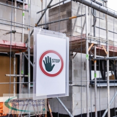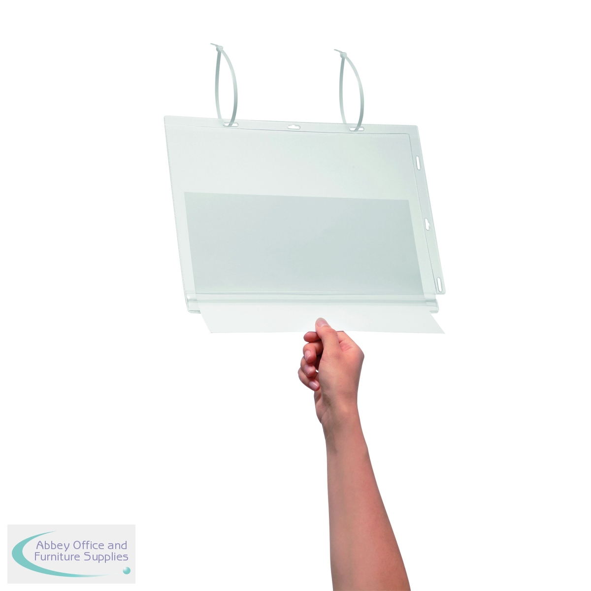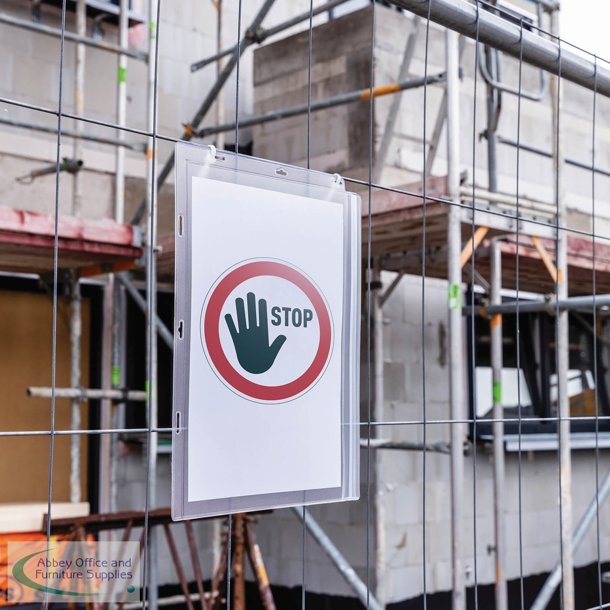 Water resistant cable tie pocket which is ideal for displaying information outdoors such as garden centres, saunas, swimming pools, gates, and notice boards, where notices encounter splashing water. The waterproof pressure closure protects the contents of the pocket especially in rain, high humidity, wetness and from dirt. Quick and easy to attach thanks to the 2 enclosed cable ties provided in long or Euro holes. IPX5 standard tested (protection against water jets from all directions). Transparent UV-stabilised and weather-resistant, scratch-resistant film with anti-reflective effect. The pockets can be used in both portrait and landscape format. The pockets have a capacity of 2 sheets 160 g/gsm, which are included in the pack. Signage templates are free to download from www.durable-uk.com.