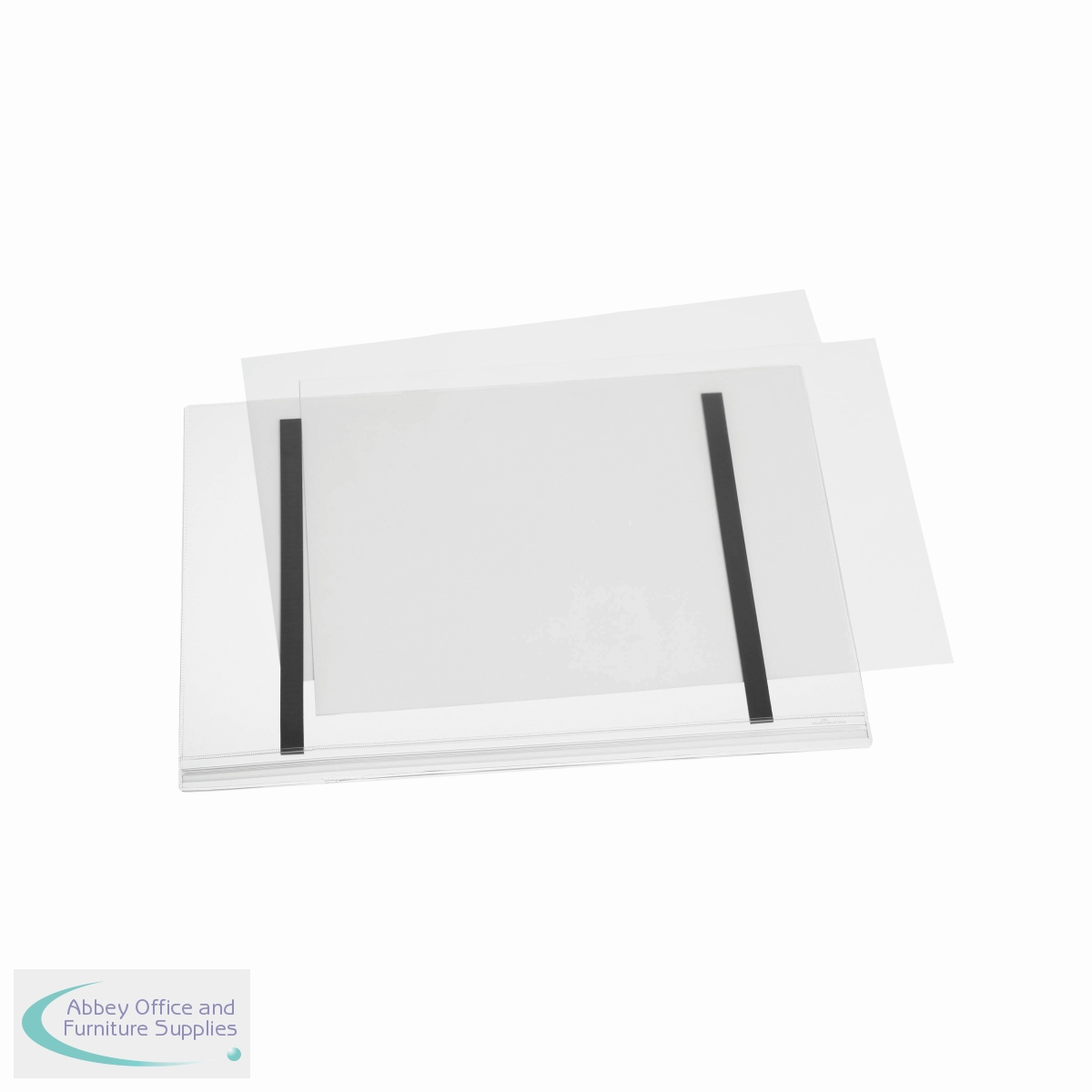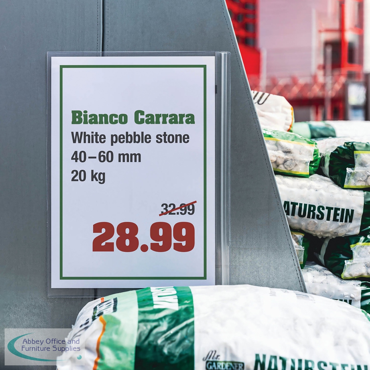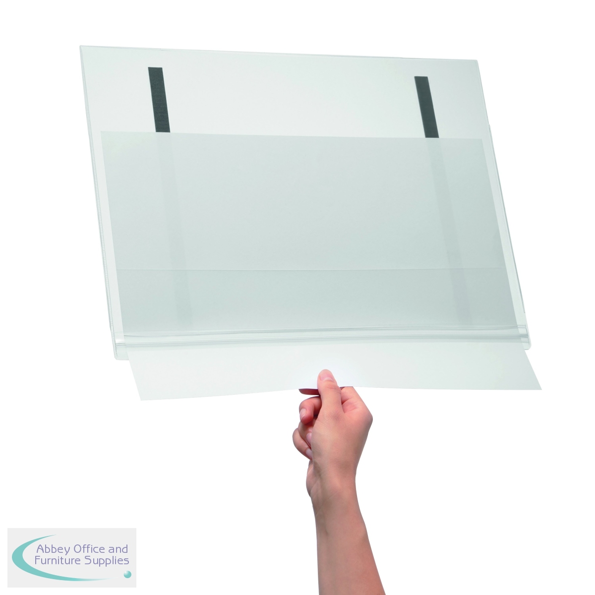 Magnetic document pocket which is ideal for displaying information outdoors such as garden centres, saunas, swimming pools, gates, and notice boards, where notices encounter splashing water. The waterproof pressure closure protects the contents of the pocket especially in rain, high humidity, wetness and from dirt. Quick and easy to attach thanks to the 2 magnetic strips with high adhesive force on the back of the display pocket. IPX5 standard tested (protection against water jets from all directions). Transparent UV-stabilised and weather-resistant, scratch-resistant film with anti-reflective effect. The pockets can be used in both portrait and landscape format. The pockets have a capacity of 2 sheets 160 g/gsm, which are included in the pack. Signage templates are free to download from www.durable-uk.com.