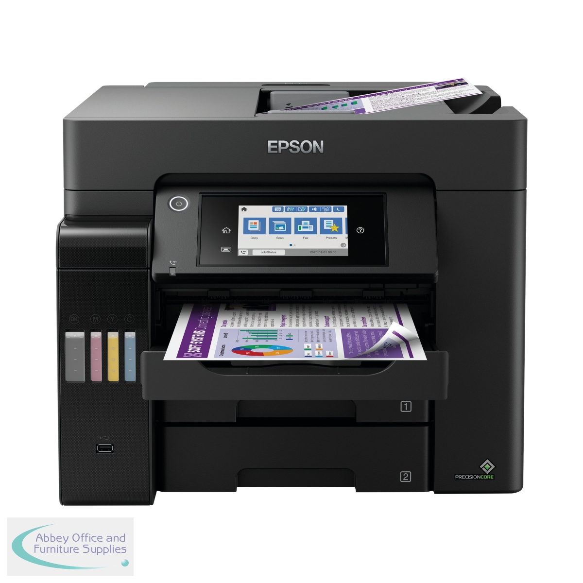 This Epson ET-5850 A4 Inkjet printer can print, scan, copy and fax. Refillable ink tanks using cost saving replacement ink bottles. Printing is fast with no warm-up time, the PrecisionCore printhead renowned for producing speeds of 25ppm. With the inks included print up to 4,500 monochrome pages (K)/2,800 colour pages (CMY). Features include an automatic document feeder for up to 35pp and duplex printing. With a contact image sensor (CIS), 1200 x 2400 dpi (HxV), able to scan double-sided. Walk-up black and white and colour fax capability, page memory up to 550 pages. Three paper trays. 50 pages automatic document feed. All controlled via an LCD touchscreen.