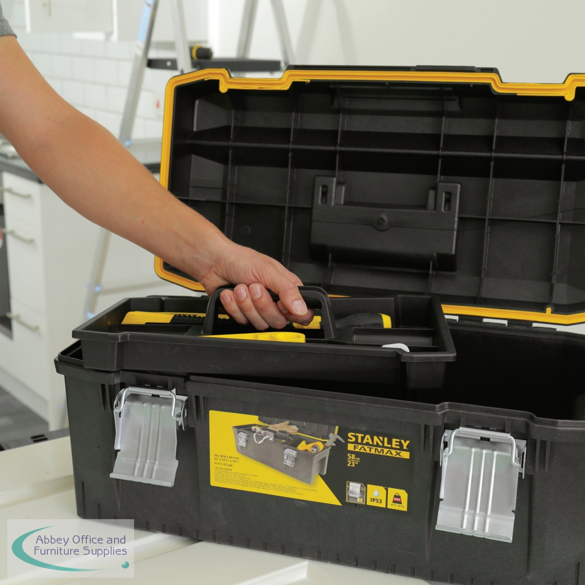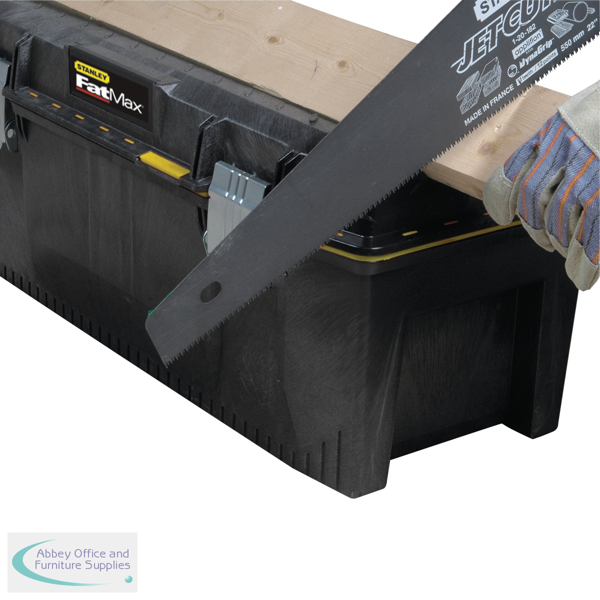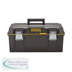 The Stanley FatMax Waterproof Toolbox is a new waterproof storage solution with all round water seal for the ultimate protection of equipment. The toolbox has been constructed of structural foam for extra strength and the tough ergonomic soft grip handle allows heavy loads to be carried with ease. The extra large storage capacity is ideal for large tools and accessories while the portable tote tray is designed to carry tools and small parts. The lid has an integrated V-Groove on top for sawing work, suitable for working with pipes and lumber. The toolbox has large metal rust proof latches with padlock for locking possibilities and measures 71x31.8x28.5cm in size.