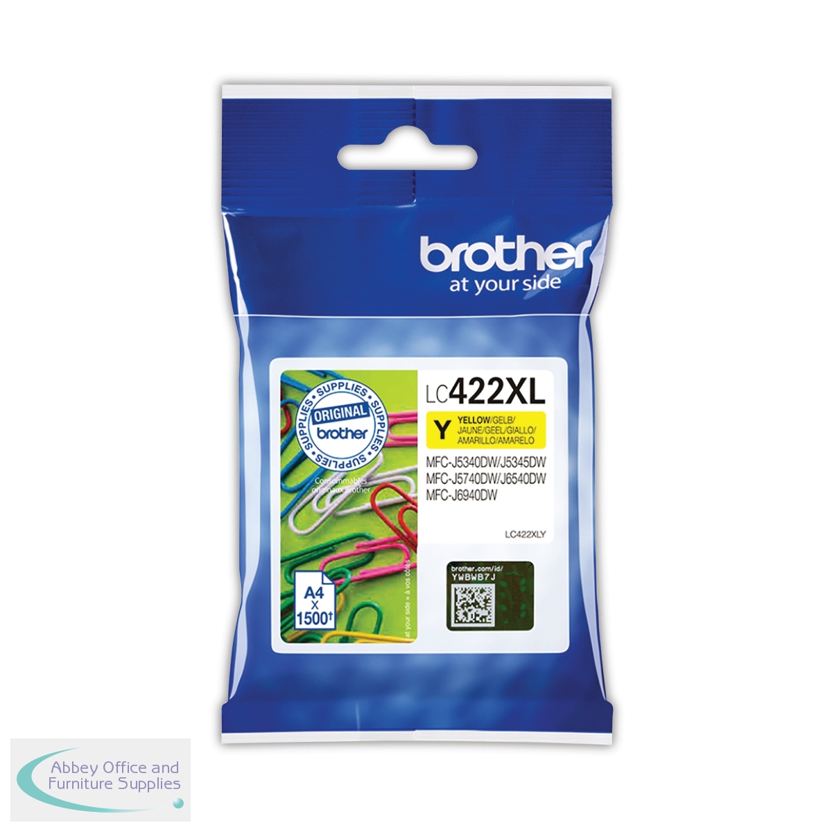 This LC422XLY ink cartridge is compatible with a wide range of Brother machines and as a genuine, original Brother cartridge you can be confident that you will get quality printouts. This high yield, single pack cartridge will print up to 1,500 pages.