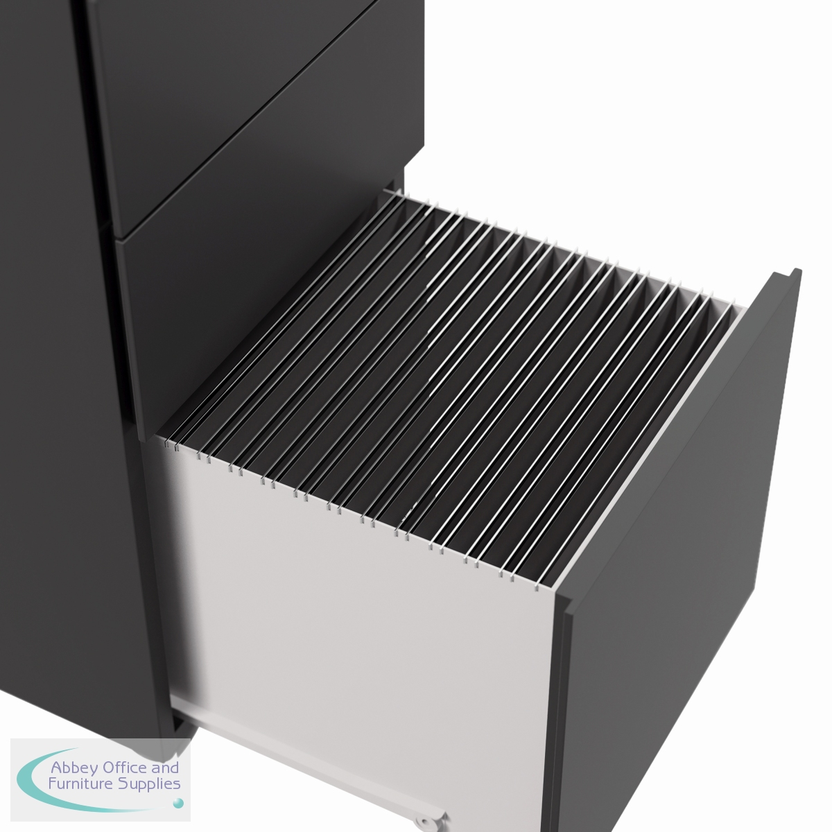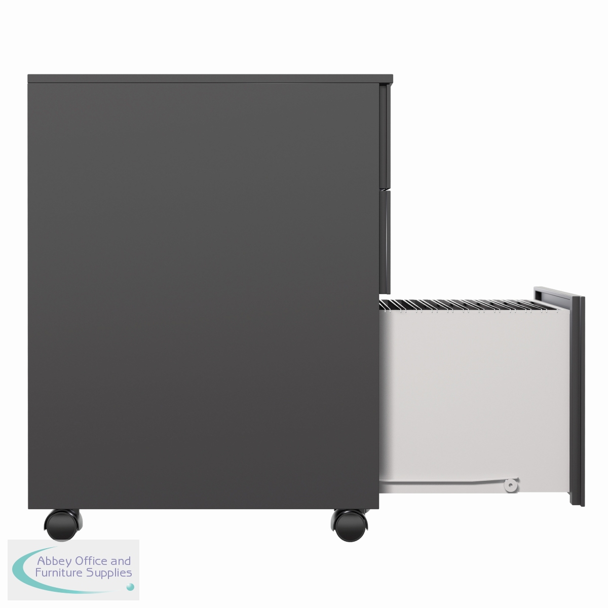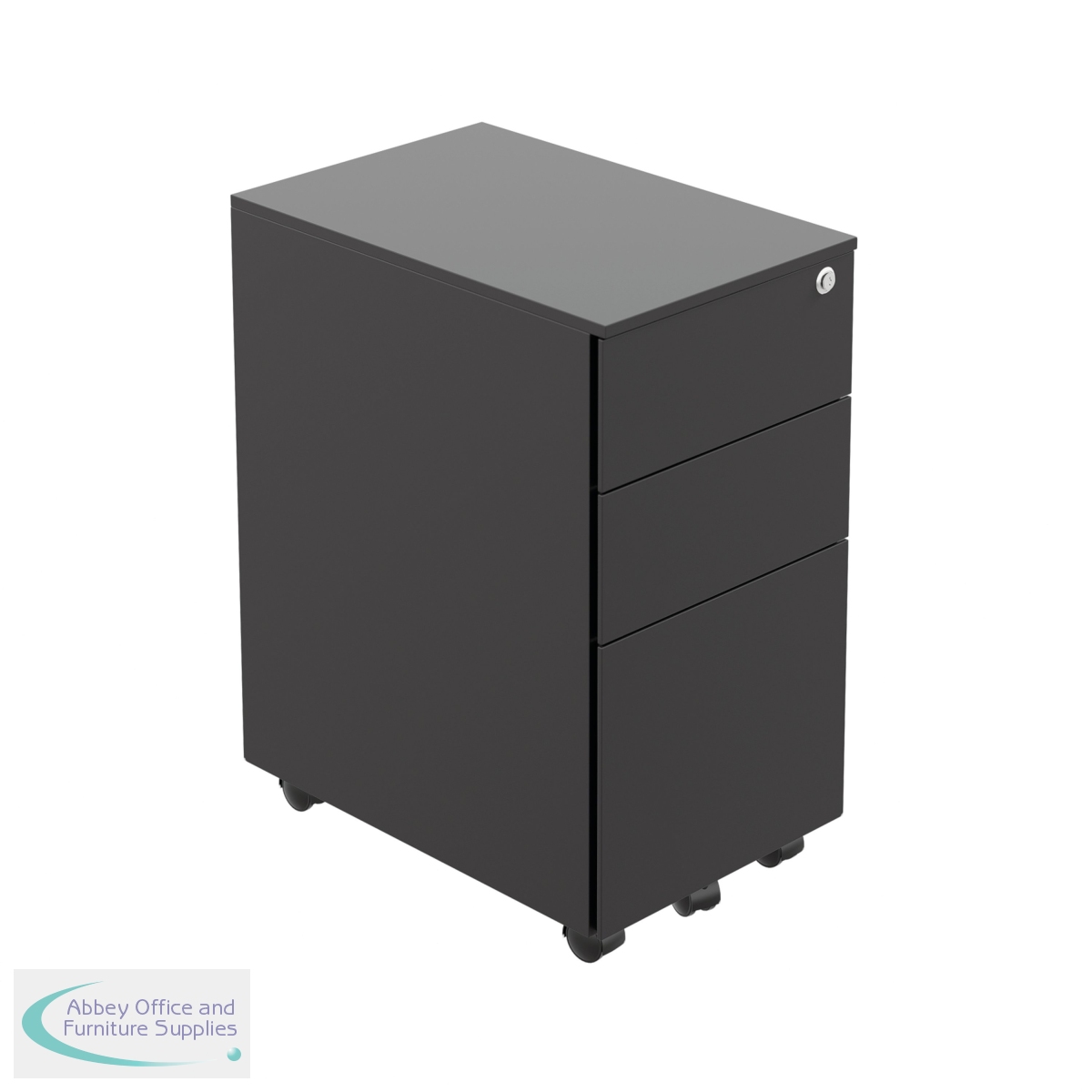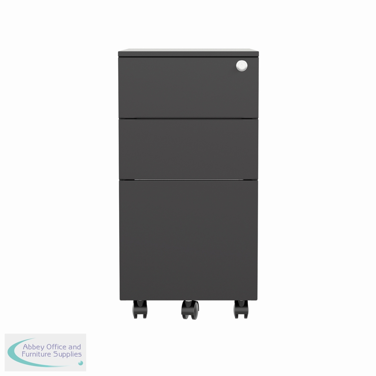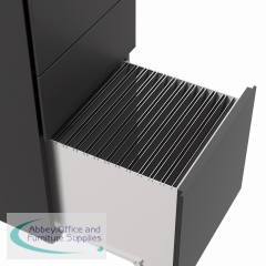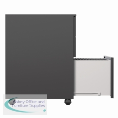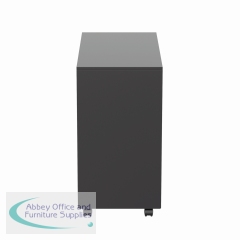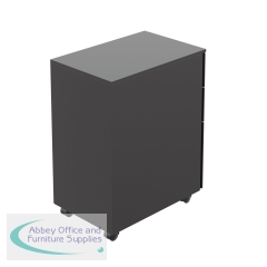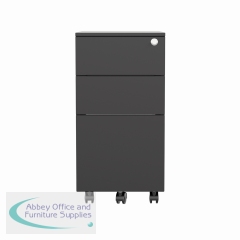 This Jemini slimline steel pedestal features 2 stationery drawers and 1 filing drawer suitable for use with A4 suspension files. The tough steel carcass features an anti-tilt mechanism, allowing only 1 drawer open at a time. The drawers can be locked for additional security. This pedestal measures 300 x 470 x 615mm and comes in a black finish. Ideal for use with smaller desks or home office.