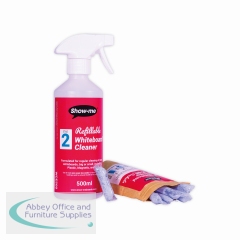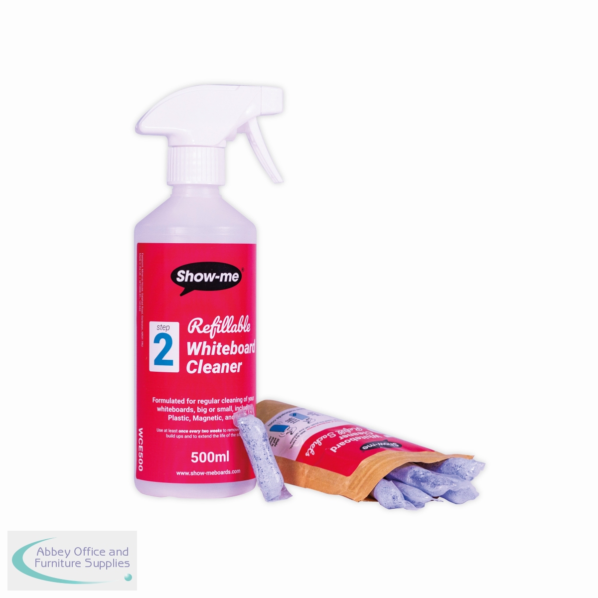 Keep your whiteboards clean and go super green. Instead of shipping litres of water around, 1 pack of 6 sachets can make 3 litres of cleaner. Get started with a Show-me refillable cleaner set, or simply reuse an existing trigger spray bottle.