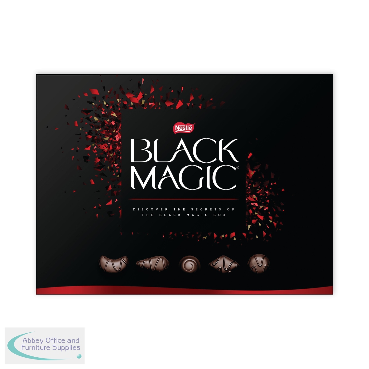 Black Magic Dark Chocolate box contains dark chocolates in a variety of caramels, wholenuts and fruit creams, 9 varieties to choose from in the box, all covered in dark chocolate: Coffee Crescent, Pure Black Magic, Midnight Truffle, Almond Crunch, Raspberry Heaven, Dreamy Fudge, Hazelnut Swirl, Orange Sensation, Caramel Heart. With minimum 40% cocoa solids. Free from artificial colours, flavours and preservatives. The perfect gift for dark chocolate lovers. Perfect gift for dark chocolate lovers. Key Features