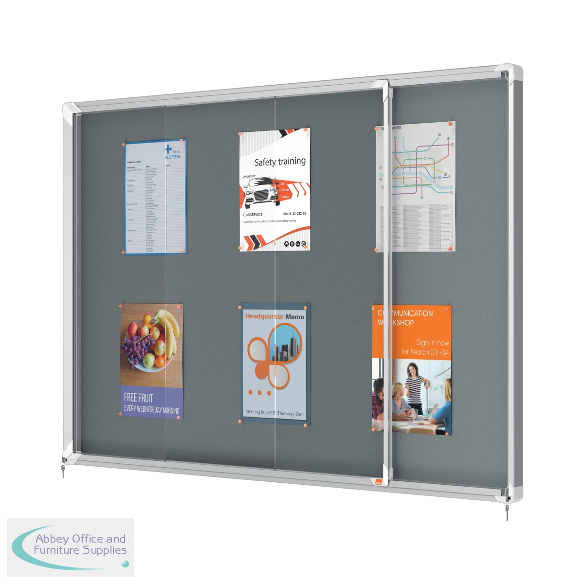 Felt lockable notice board with sliding glass doors and unobtrusive integrated corner lock. Complete with a modern stylish aluminum trim and fixed with a rail and through corner wall mounting. Excellent felt notice board surface to securely pin and display your notices. Size: 18 x A4 sheets.