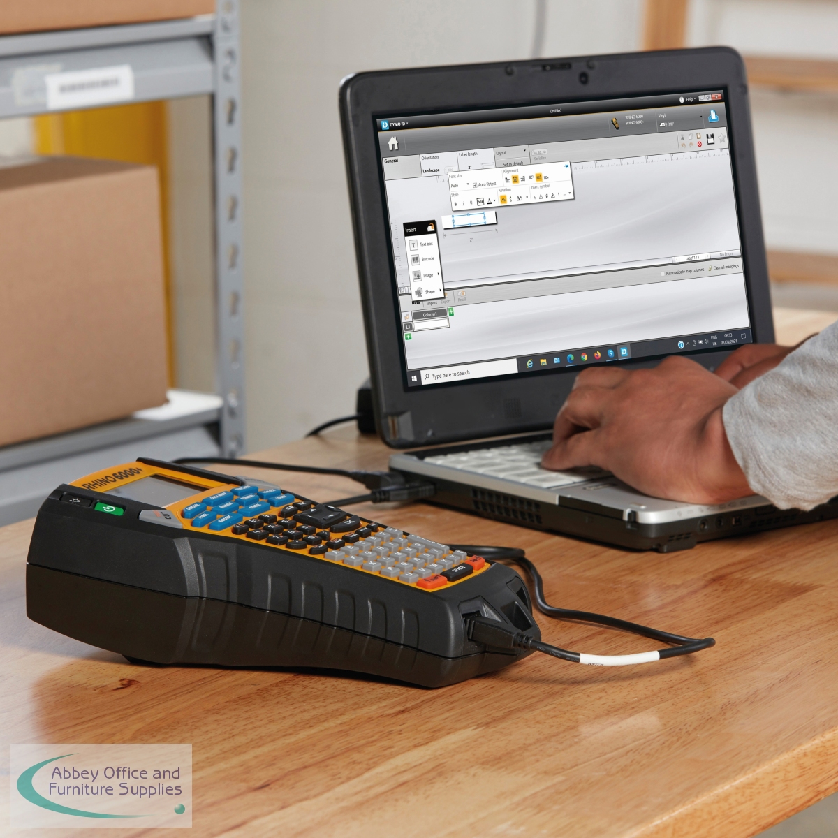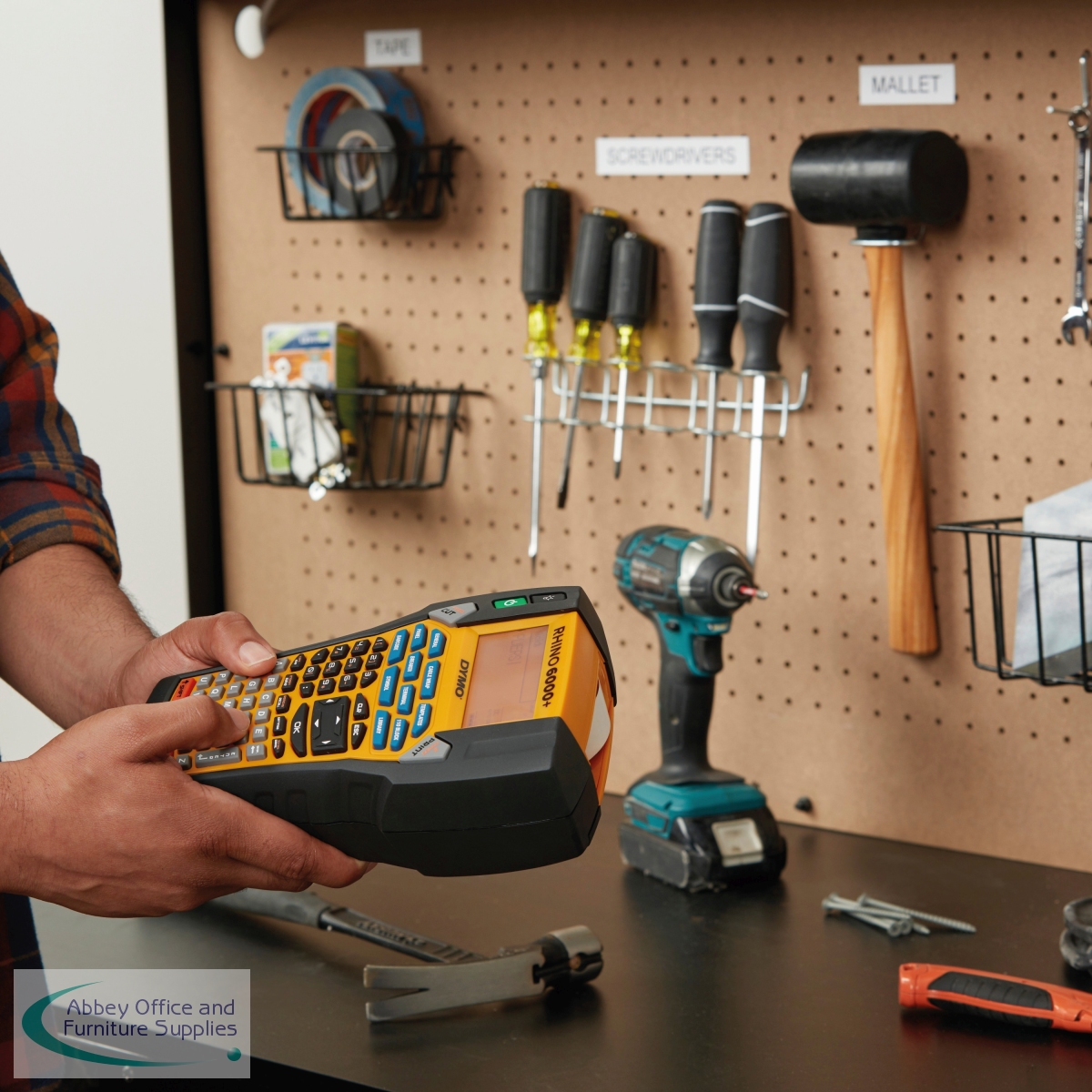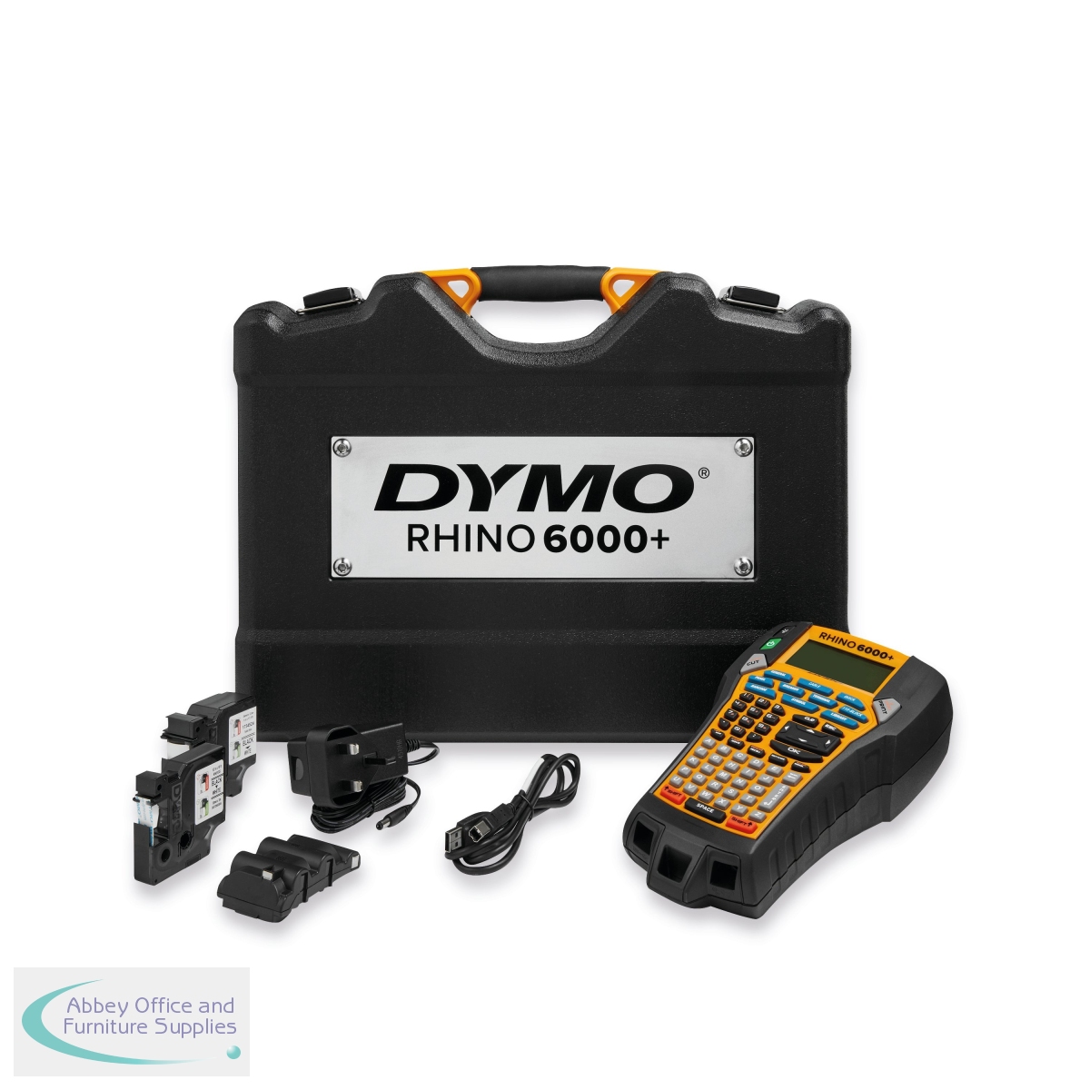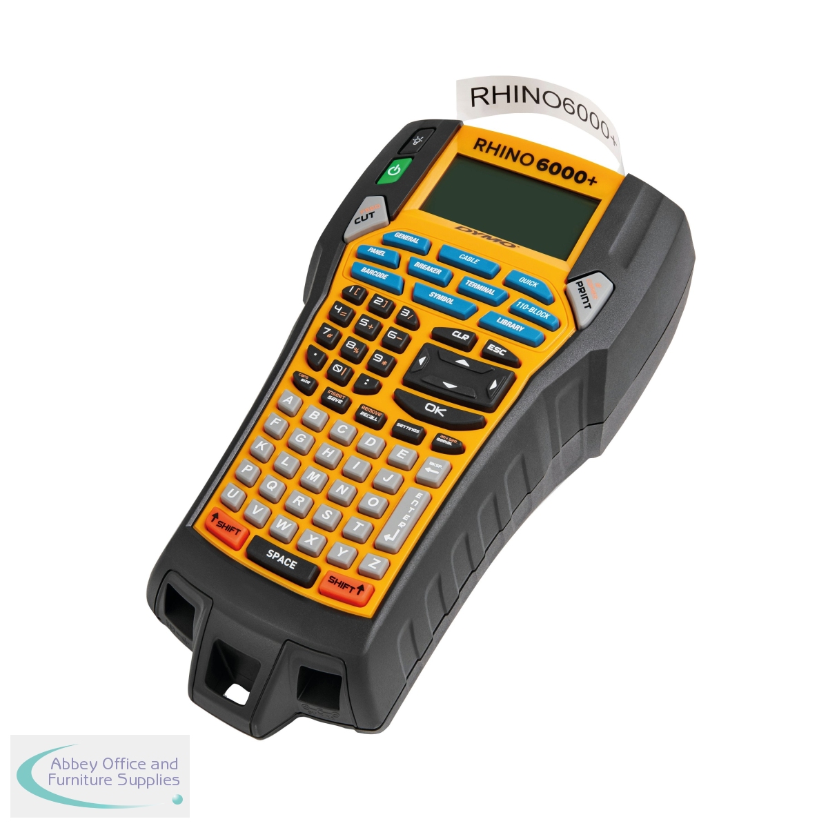 DYMO Rhino 6000Plus Industrial Label Maker. Computer Connected Label Maker with Hard Carry Case. An Industrial label maker built for quick labeling on the jobsite, packed with time-saving shortcuts for labeling any installation quickly and professionally. Create labels including barcodes and complex label layouts from DYMO ID software on PC, and print with Rhino 6000Plus for easy editing. Meets key ANSI and TIA/EIA-606-B industry labeling standards. Provides one-touch 'Hot Keys' to automatically size, space and format label text, for electrical and patch panels, terminal and 110 blocks, wire and cable flags, horizontal and vertical warps, as well as vertical and fixed-length applications. Works with 32- and 64-bit Windows 7 or later. Supplied with a hard carry case, 1 vinyl tape cassette, 1 flexible nylon tape cassette and rechargeable lithium ion battery.