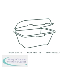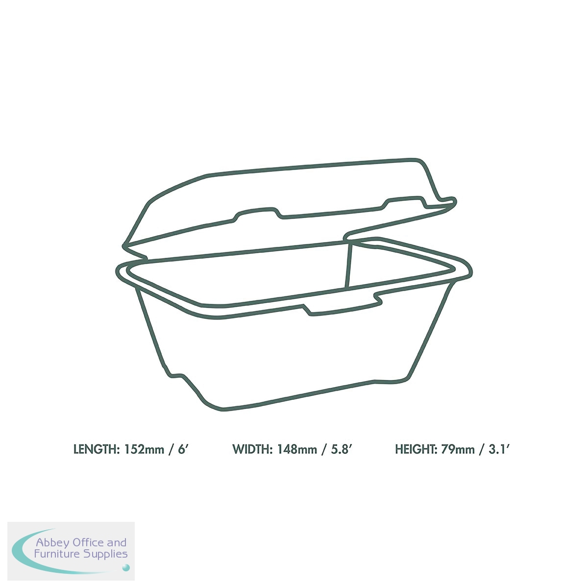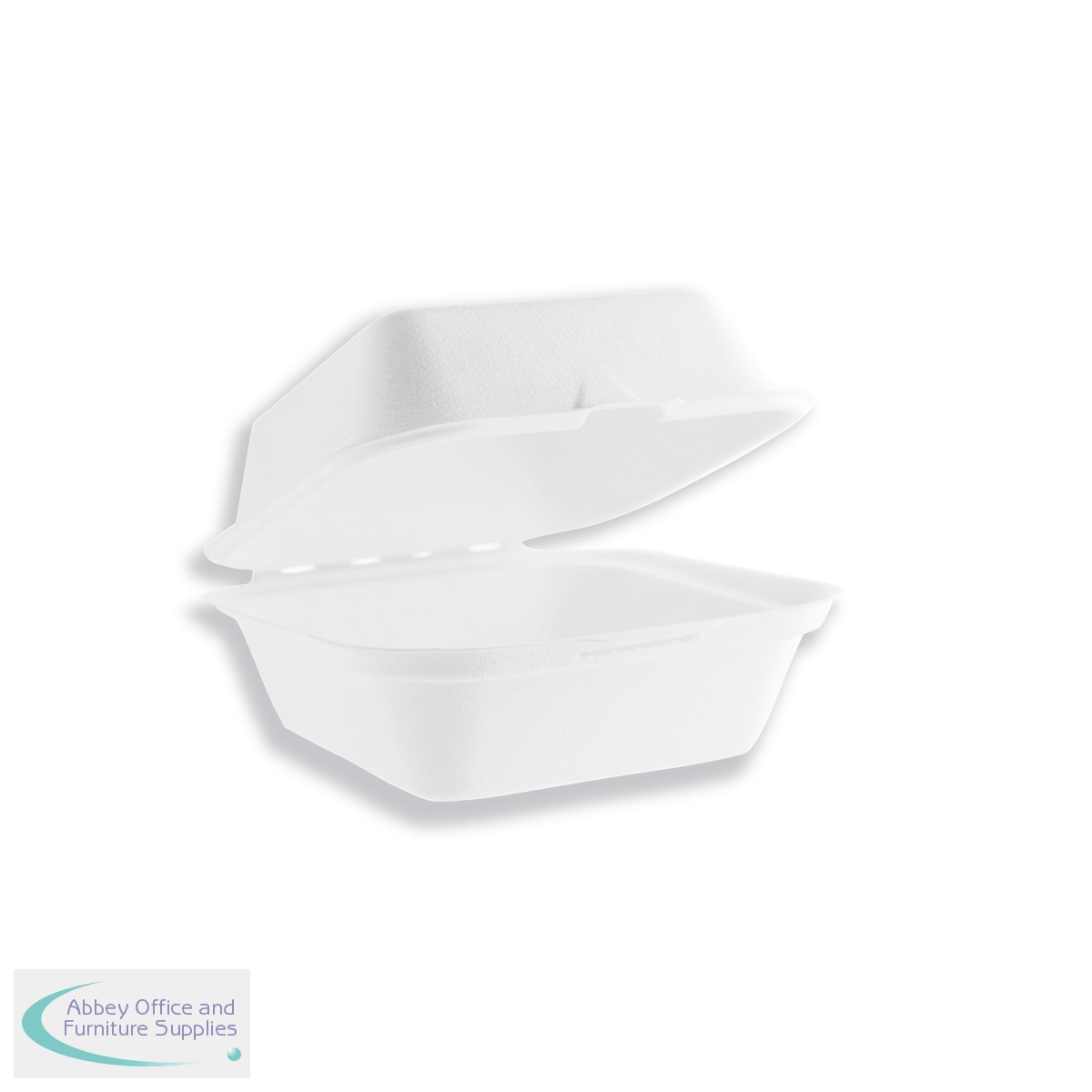 Practical and stylish burger clamshell. Doesn't trap condensation, so hot food stays crispy. The lid and base are equal depth, so when open form two trays. For hot or cold food to go - but especially burgers. Bagasse is recycled sugarcane fibre. Tree-free! Stylish white. Award-winning quality by Vegware, made from plants. Commercially compostable where accepted.