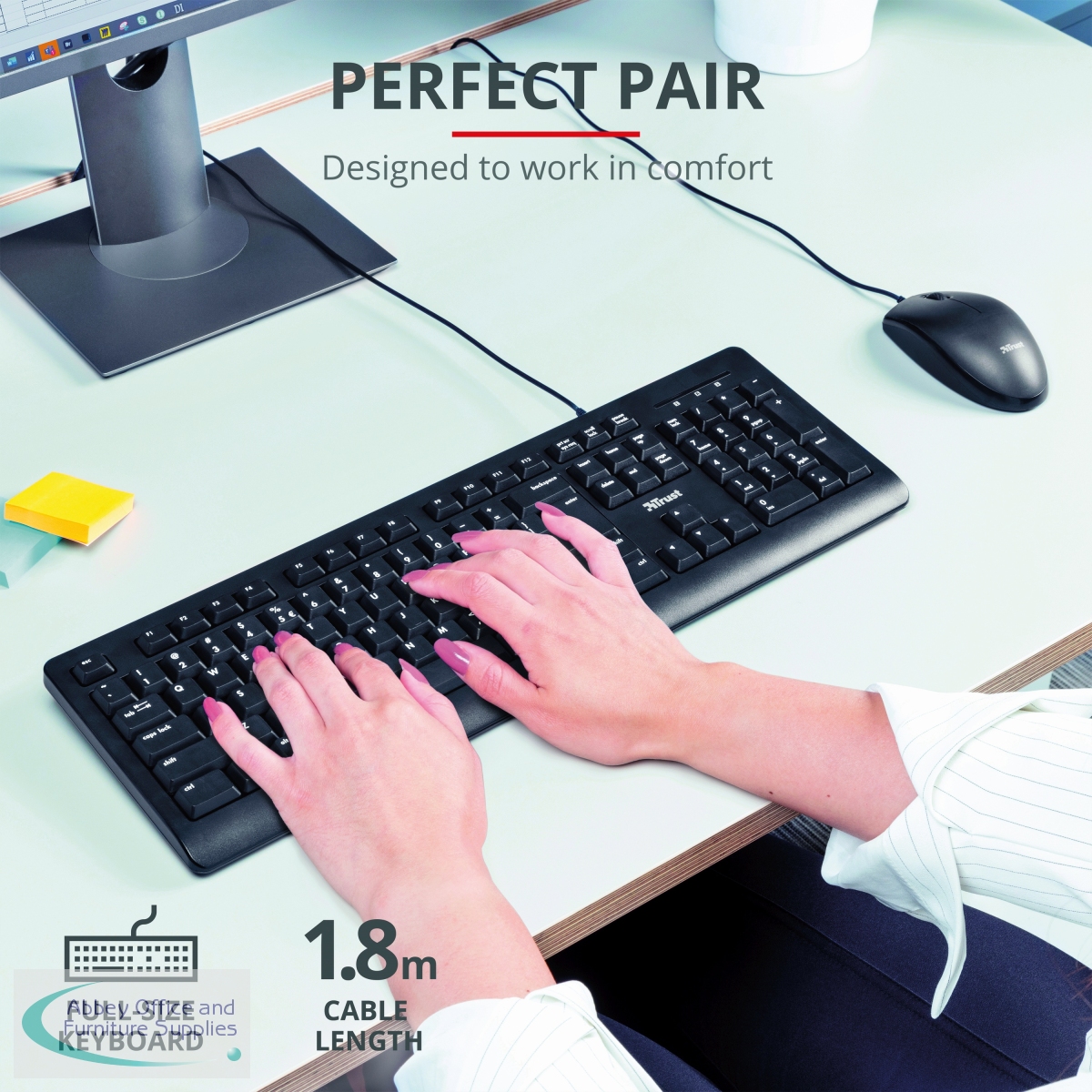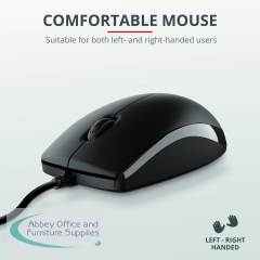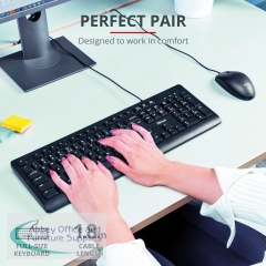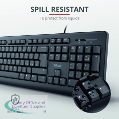 Trust TKM-250 Wired Keyboard and Mouse Set provides optimal efficiency and productivity, so you can work quickly. The full-size keyboard has a spill-resistant design keeping your keyboard safe from liquids. The fold-out feet adjust the keyboard's height, so you stay comfortable. The TKM-250 mouse can be used by either left or right handed users.