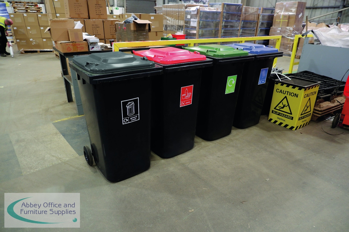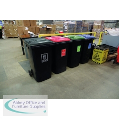This set of four 240L wheeled bins with colour coded lids for easy recycling. Lid colours include grey, red, green and blue. Complete with 4 recycling stickers: general waste (grey), plastic (red), mixed recycling (green) and paper (blue). Manufactured and tested to EN840 - DIN30700. Made from virgin material for maximum strength and life. Resistance to UV, cold, heat and chemicals. Solid steel galvanised wheel axle with tyres. 100% Recyclable at the end of life.