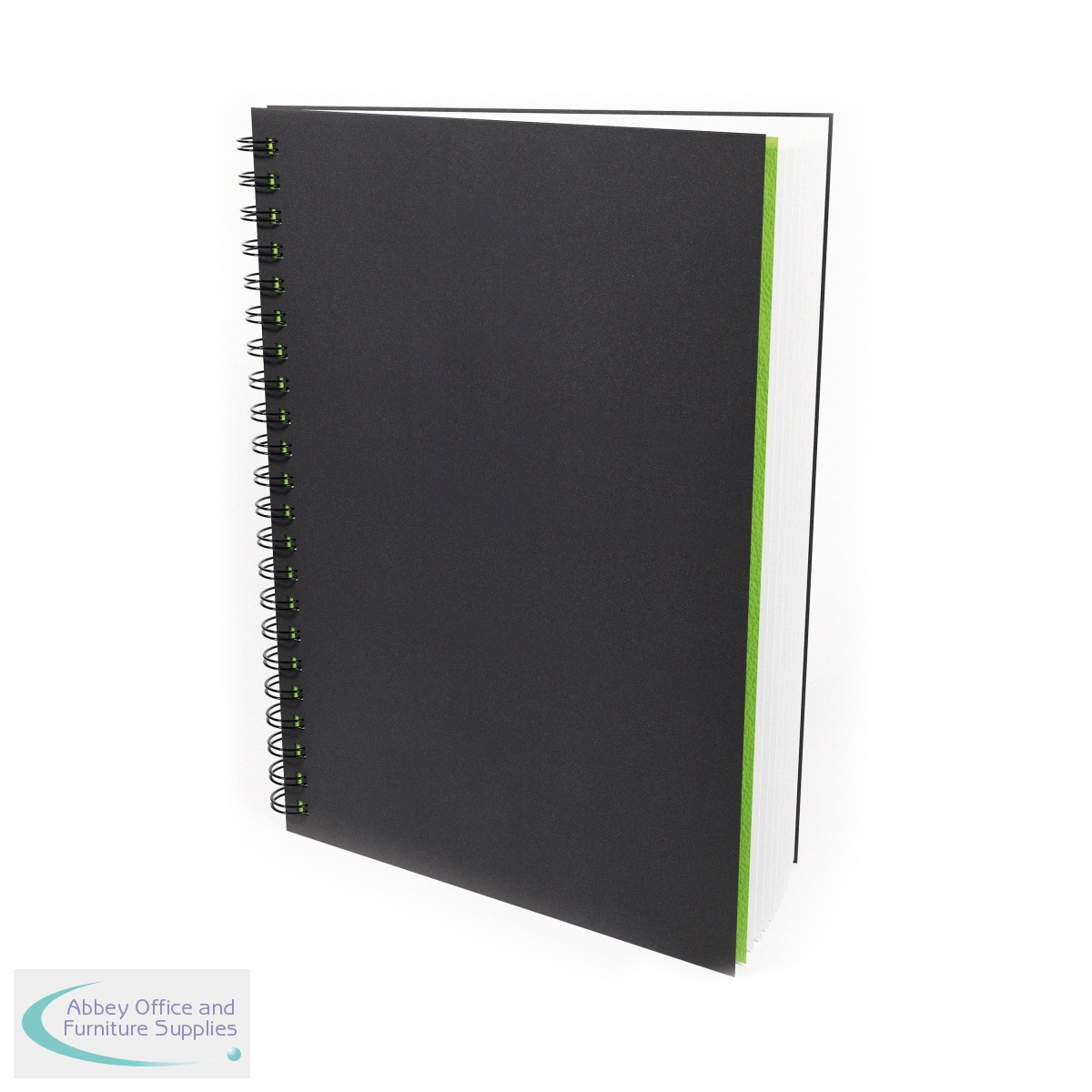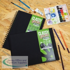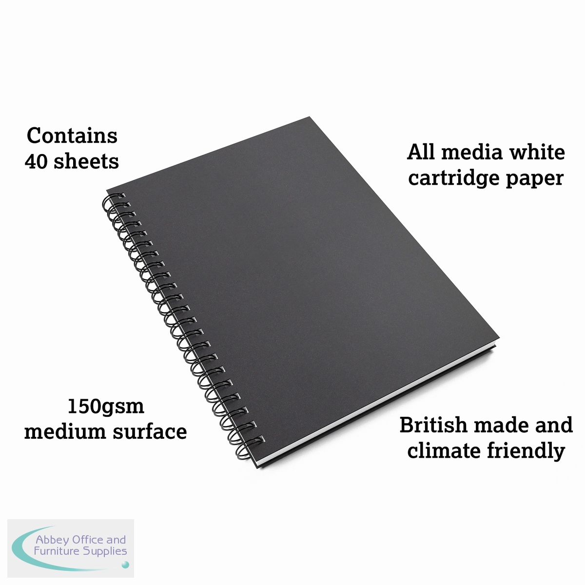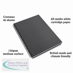 This British made, A4, portrait sketchbook contains 40 sheets (80 pages) of 150gsm, acid free, premium white cartridge paper. The medium surface makes it suitable for all types of media. Encased in a sturdy, black, hardback cover with a 'soft touch' laminated finish, the notebook is both durable and easy to clean. The paper is sized for wet strength, making it more resistant to bleed through and suitable for a variety of techniques. The large twin wire binding allows the sketchbook to lay flat whilst working and offers space for the sketchbook to expand as it fills with creations. Sourced from sustainable forests, this climate friendly notebook is the perfect choice for anyone looking to be more conscious about the environment.