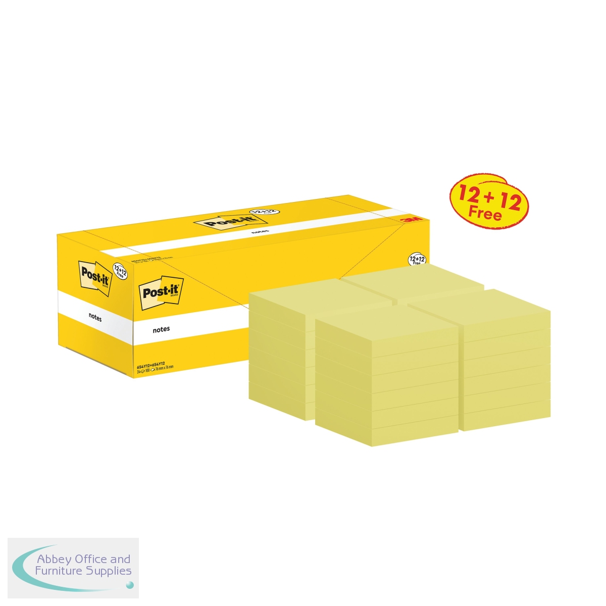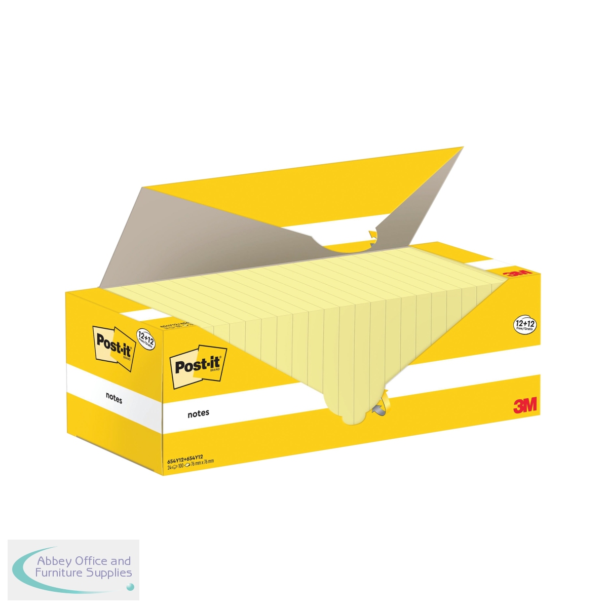 3M06579 - Post-it Notes 76x76mm 100 Sheets Canary Yellow VALUE PACK 12 + 12 FREE (Pack of 24) 654Y12+654Y12