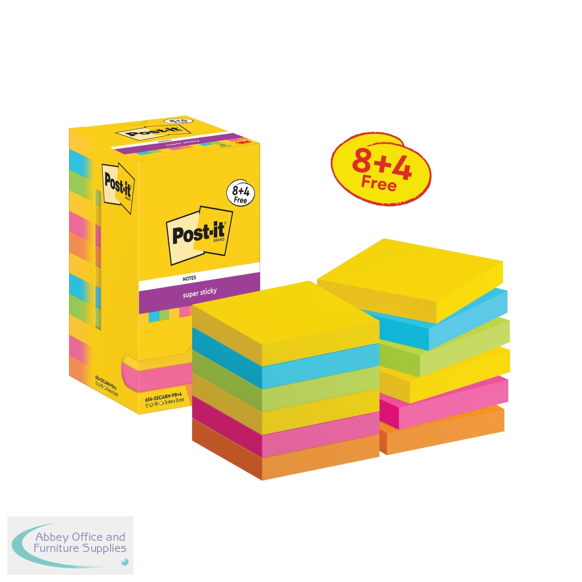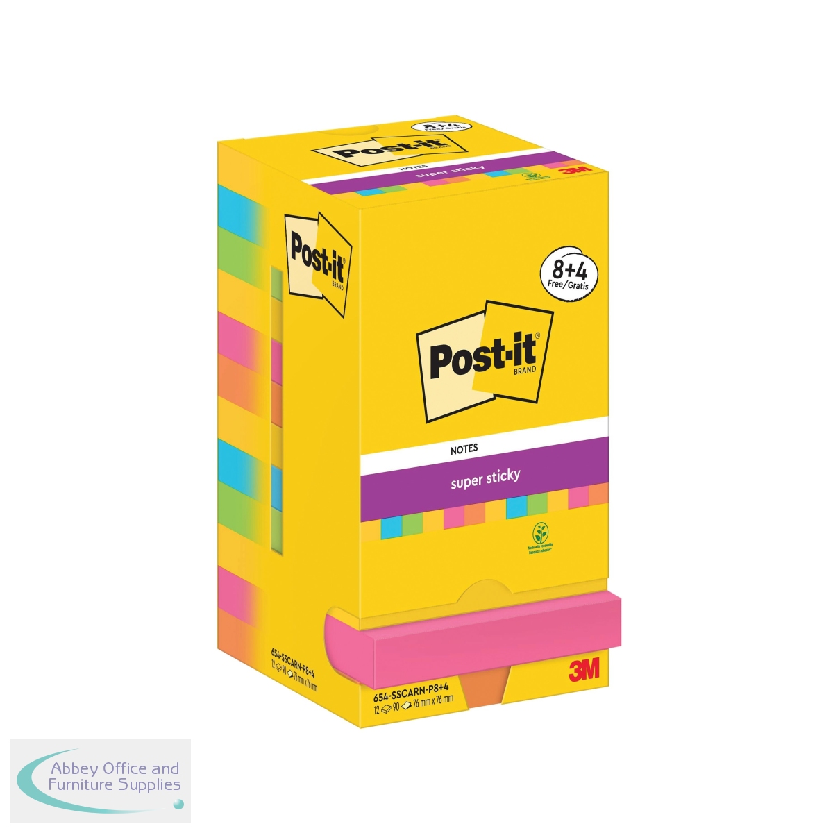 3M06564 - Post-it Super Sticky Notes 76x76mm 90 Sheets Carnival VALUE PACK 8 + 4 FREE (Pack of 12) 654-SSCARN-P8+4