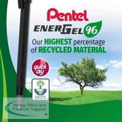EnerGel Eco 96 is made using 96 per cent post-consumer recycled material making it Pentel's most sustainable writing instrument to date. EnerGel Eco 96 contains quick-drying EnerGel ink which reduces smudging on hands and paper making it ideal for both right and left-handed writers. The snap-fit cap closes with a reassuring click and the barrel has a grooved finger grip for comfort and control. Suitable for refilling thus reducing waste and minimising environmental impact the pen conforms to BS 7272: 1 2: 2008 pen cap and end plug safety standards and is ideal for everyday use in the office school or home. Supplied in pack of 12 black pens with 0.7mm tips.