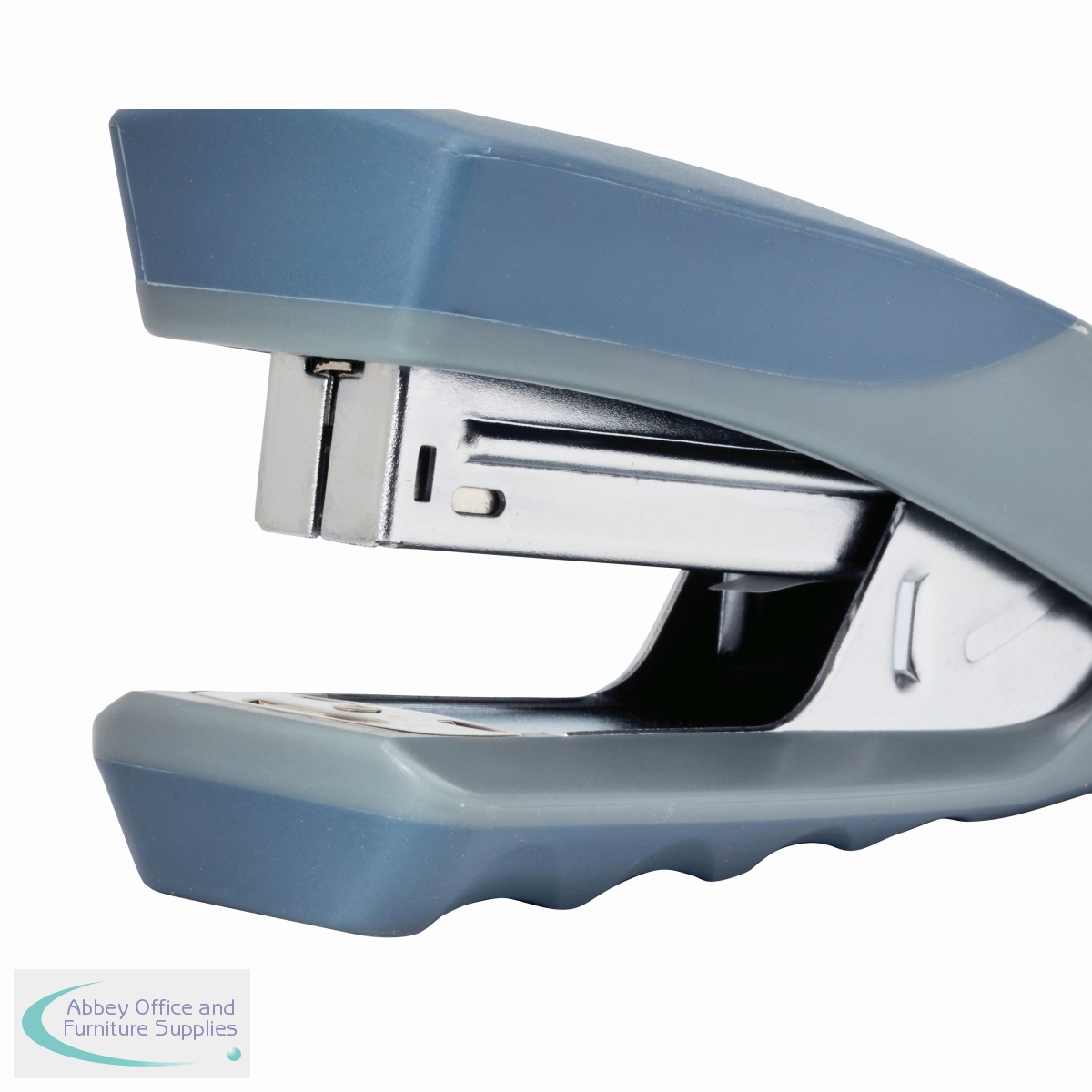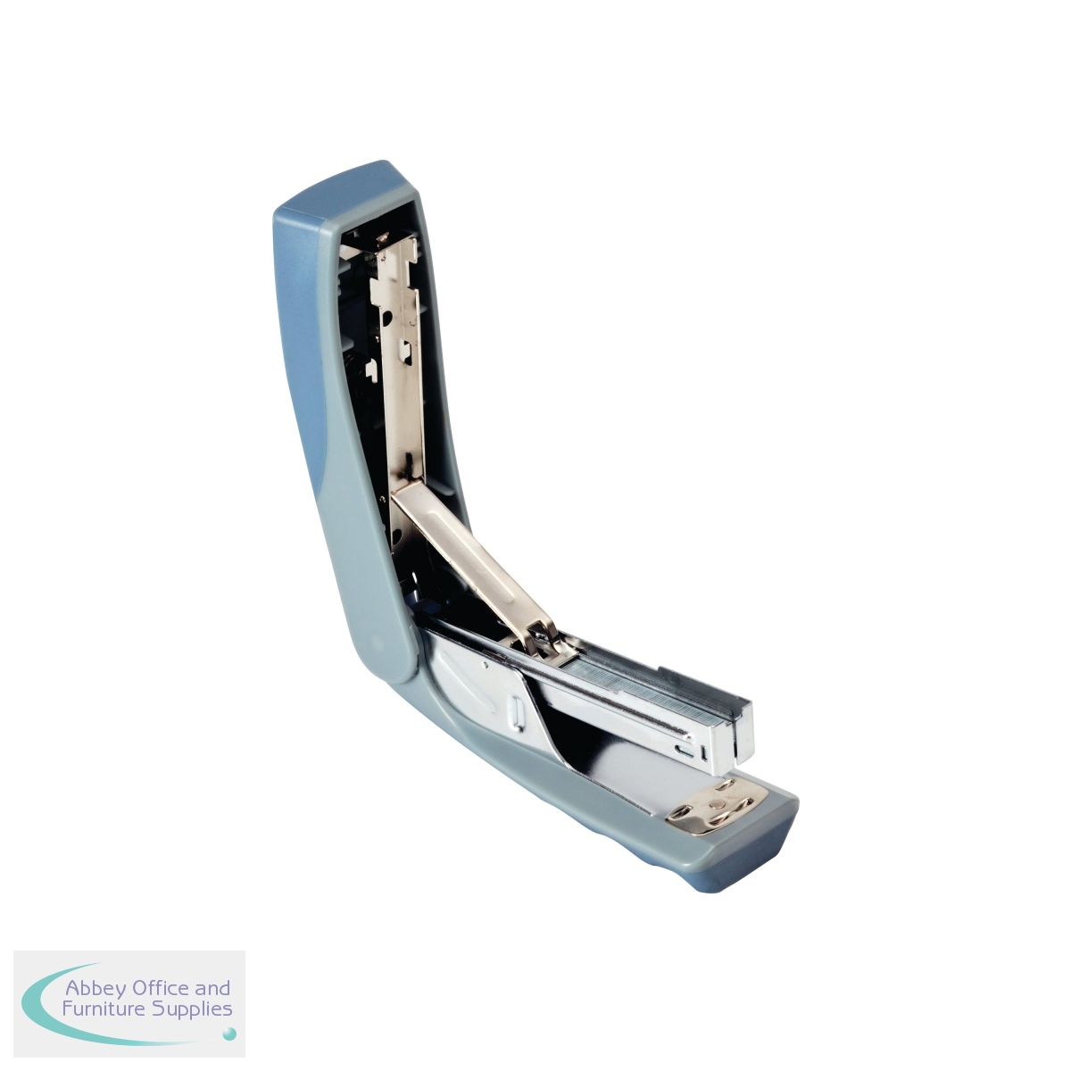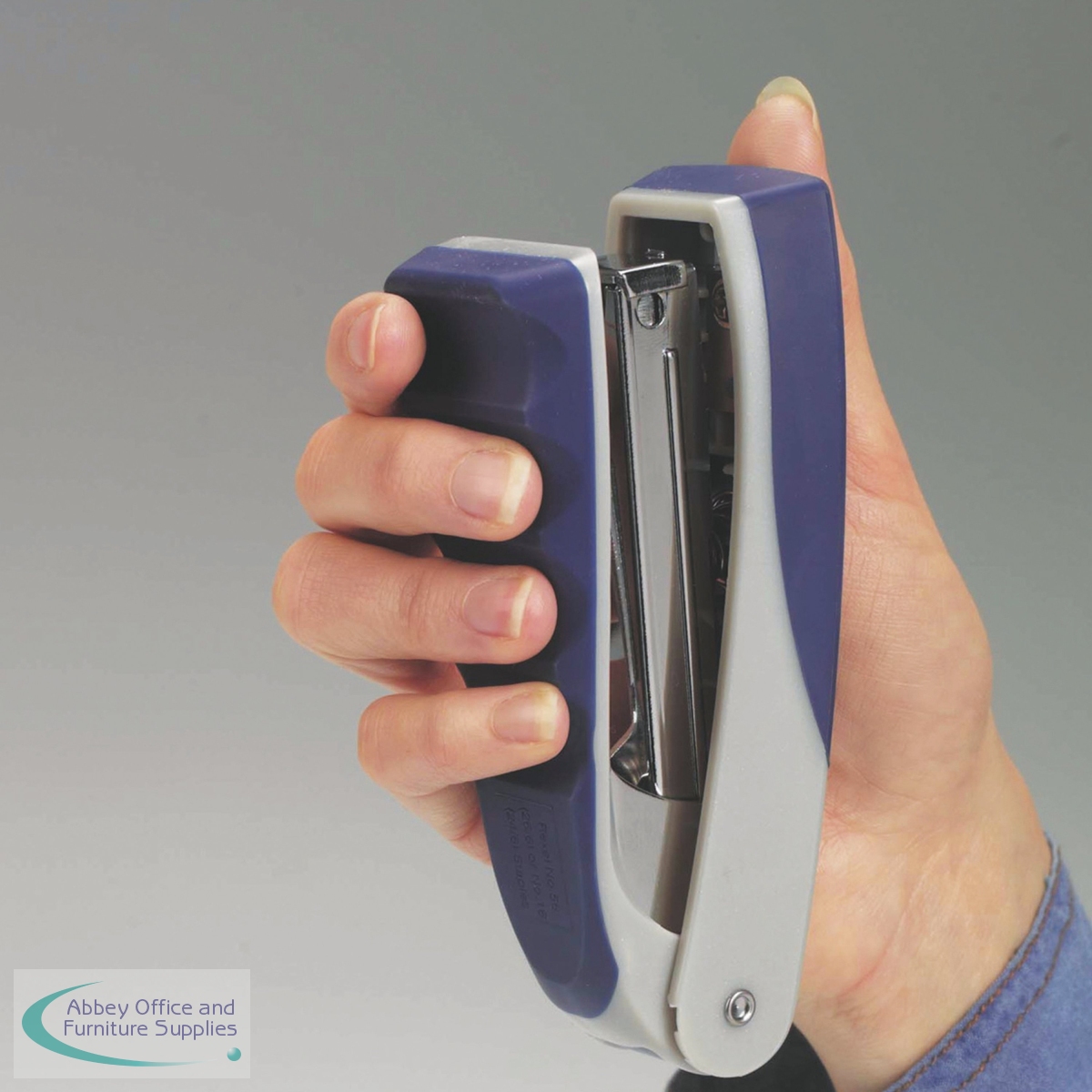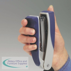 Made from robust metal, this versatile, stapler can stand upright on the desk or sit like a traditional stapler. Designed to fit in the hand, with comfortable cushioned finger grips and a soft-feel rubber caps to ensure effortless one-handed use, the compact Rexel Centor stapler staples up to 25 sheets of paper. It is compatible with No.56 (26/6) and No. 16 (24/6) staples via the simple top loading mechanism. Supplied in grey with blue trim.