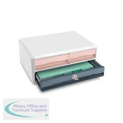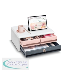 This agile module will suit home-working with an ultra robust monitor riser which helps to promote good posture. Featuring two half-drawers to store office supplies and computer accessories; plus one large drawer for documentation measuring up to 240x320mm; and, a tablet, computer or laptop measuring up to 14 inches. Made from 100% recyclable, high quality plastic, the station measures W370xD274xH146mm with a storage capacity of half- drawer (W245xD160 H40mm); and a large drawer (W328xD245xH40mm). The smooth sliding drawers with retaining stops are GDPR compliant, locking with a key to protect confidential documents and personal belongings; and, a security notch at the back which allows the installation of an anti-theft cable (not provided). Supplied in pink/grey.