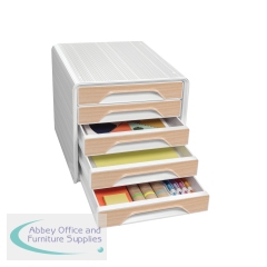 Measuring W288xD360xH270mm, sculpted in one piece, offering an ultra robust body with a textured finish, the Silva Smoove module features five drawers printed with a beech pattern for a soft and decorative style. The drawers are sized to fit documentation measuring up to 240x320mm with a height of 40mm. Featuring a retaining stop to prevent drawers from sliding out, the smooth sliding drawers are equipped with ergonomic handles and a base access slot for easy retrieval of contents. Complete with anti-skid pads and labels, this module is made from 100% recyclable, high-quality plastic, printed with 100% recyclable solvent-free inks. Supplied in white/beech.