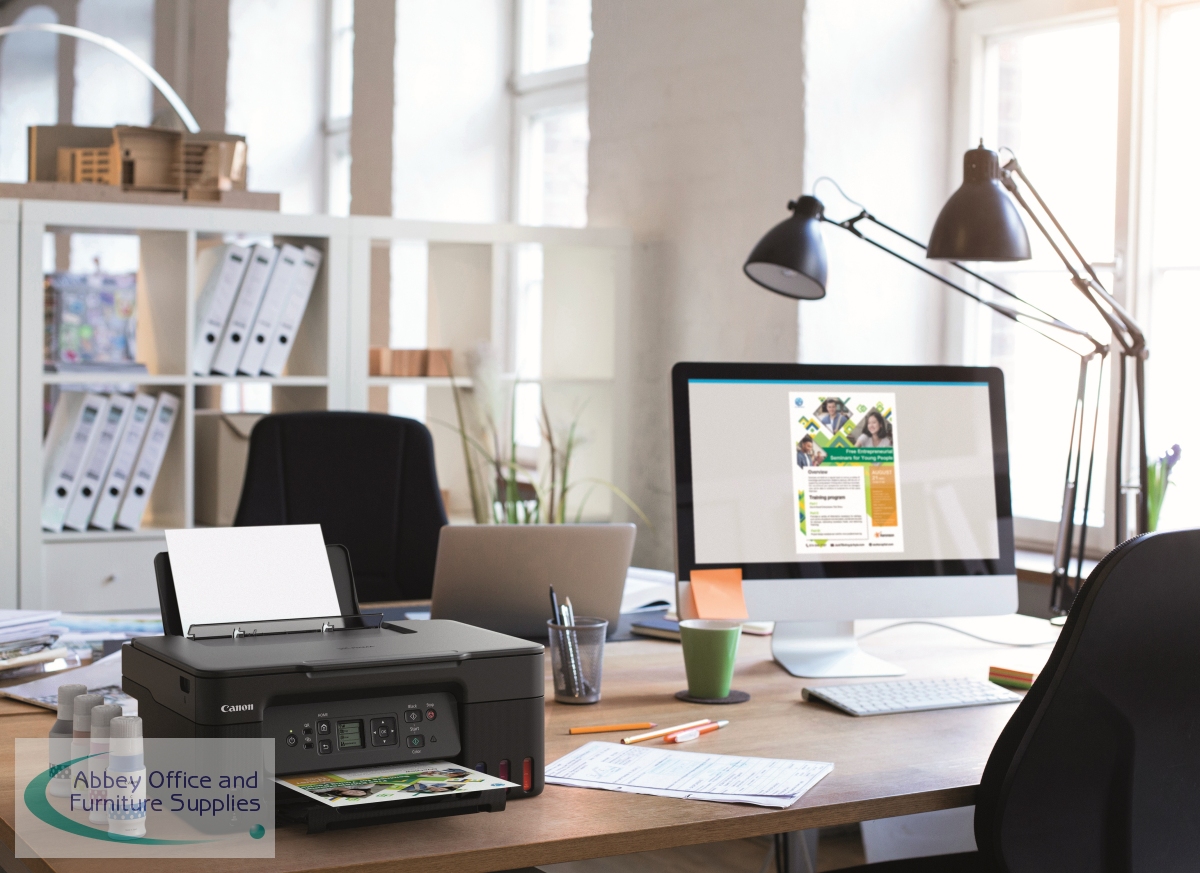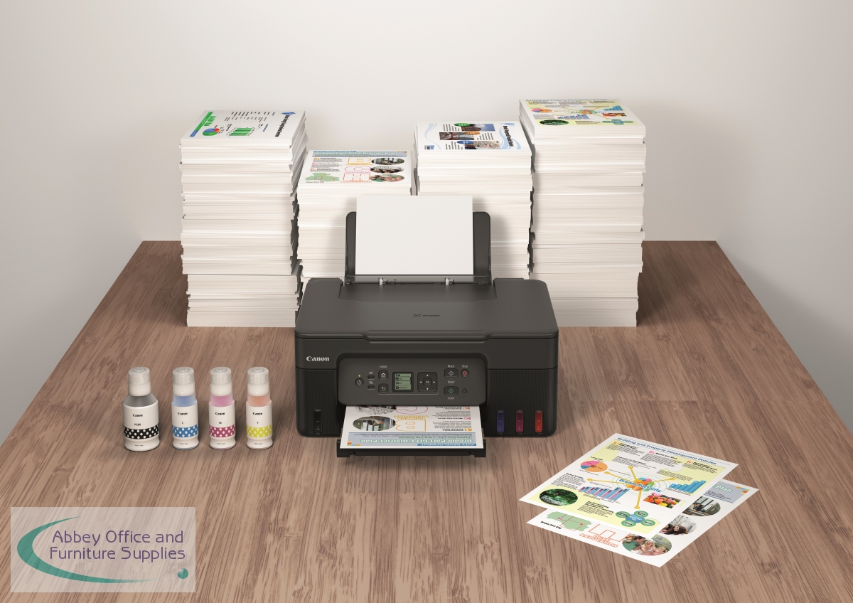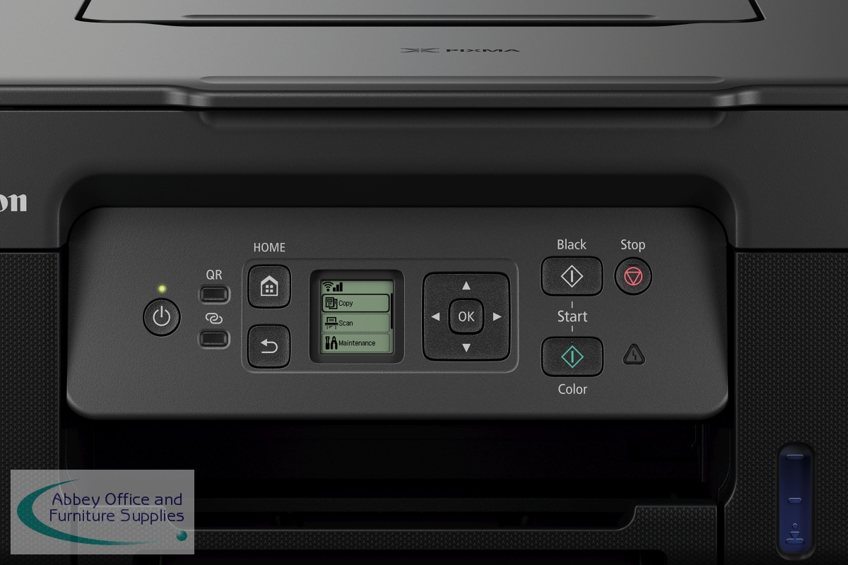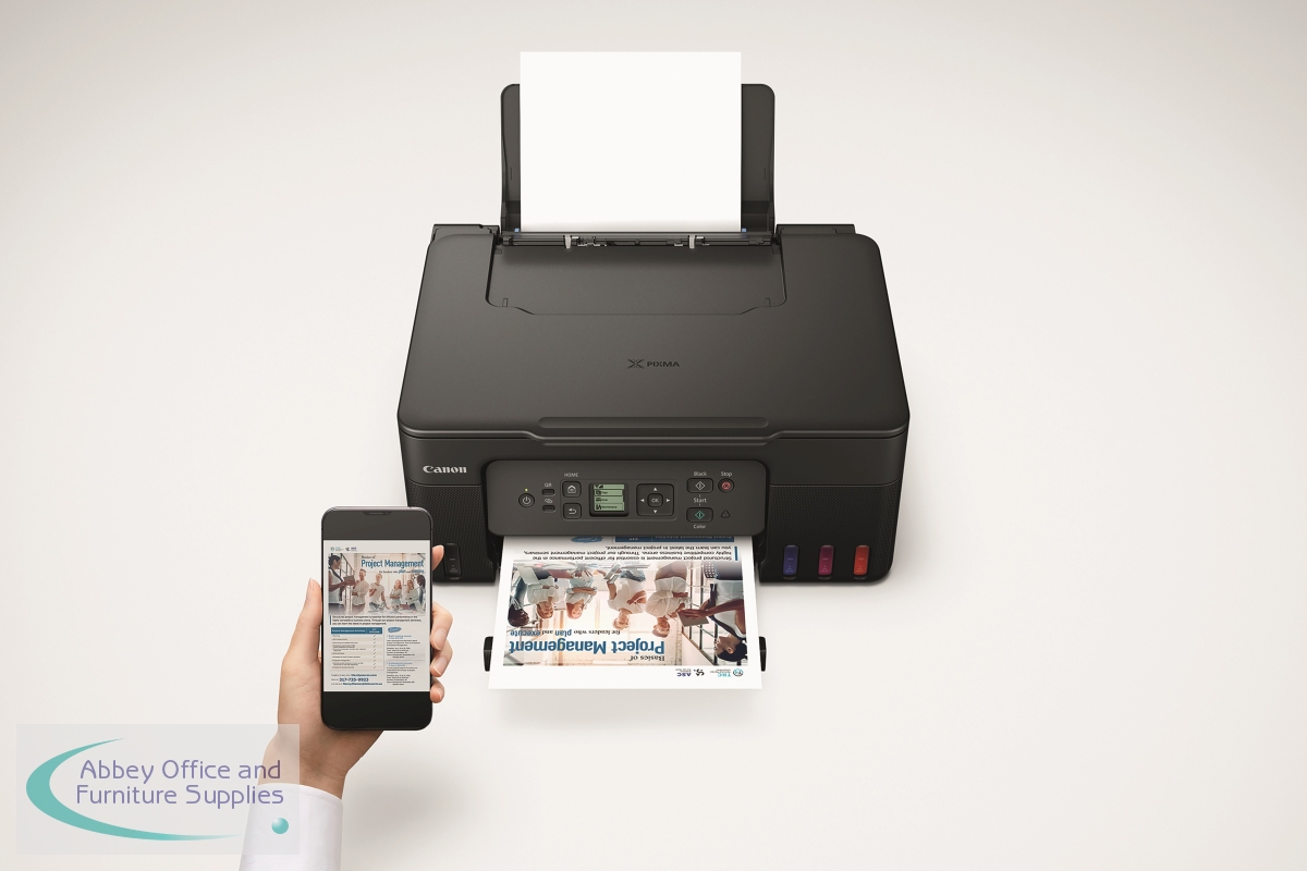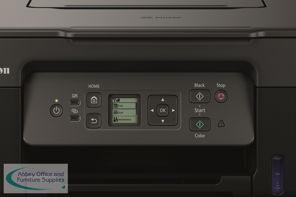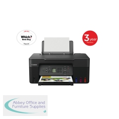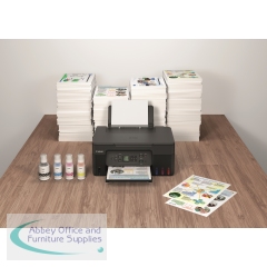 The Canon Pixma G3570 multifunctional printer in black, can print, copy and scan. Print resolution up to 4800 x 1200 dpi. The G3571 is a refillable ink tank printer and has 2 FINE print heads (Black and Colour). With a mono print speed of approximately 11 ipm and colour print speed of approximately 6.0 ipm. Standard interface: Hi-Speed USB (USB B Port), Wi-Fi; Wireless printing requires a working network with wireless 802.11bgna or ac capability, operating at 2.4GHz. Comes with a rear paper tray, with a 100 sheet capacity. The G3570 has a CIS flatbed photo and document scanner, with 600 x 1200 dpi (optical) resolution, with a maximum document size of A4LTR. The copying specification allow for 3 levels of copy quality; Economy, Standard and High and 9 intensity levels. Capable of up to 99 muliple copies. Copy zoom of between 25 and 400 percent.