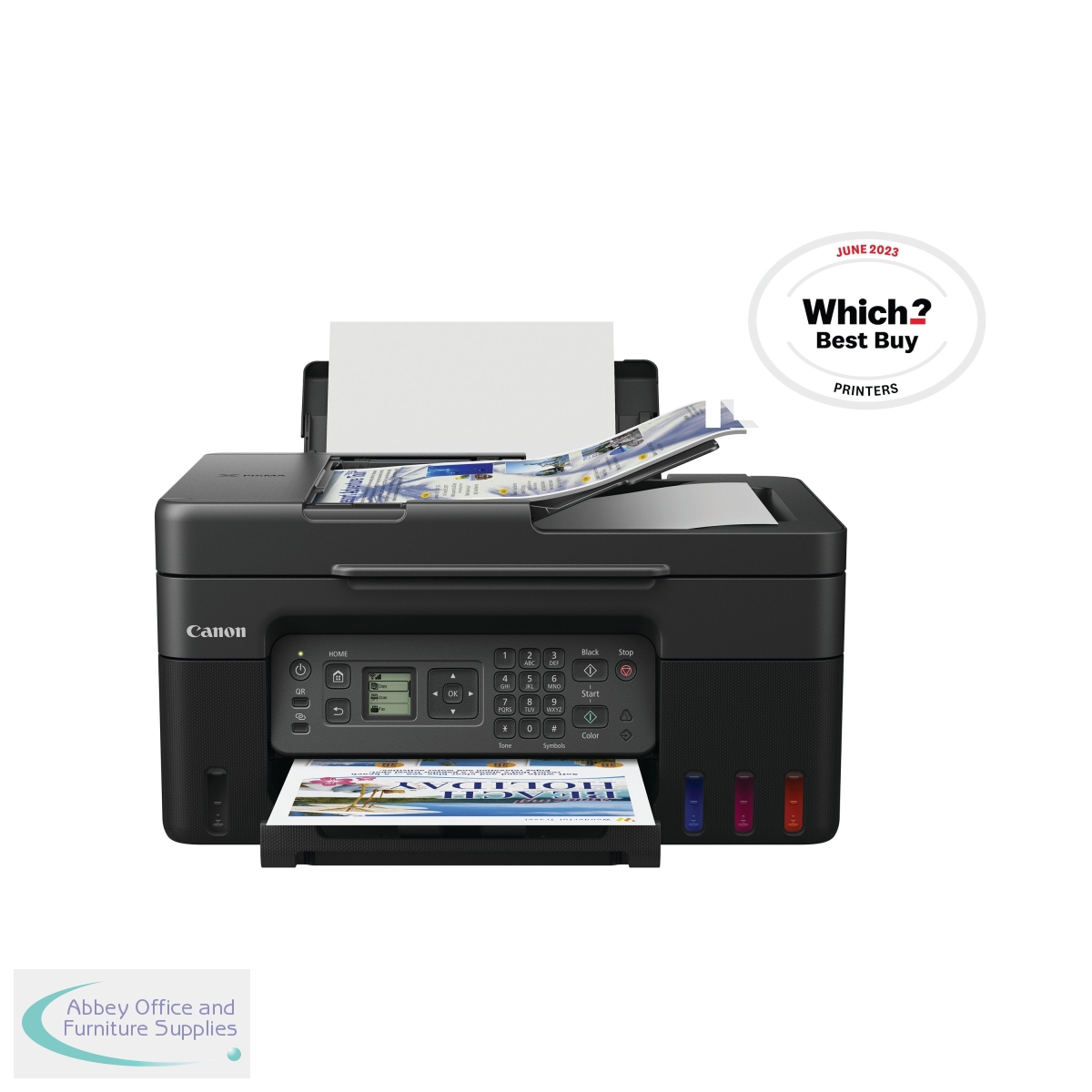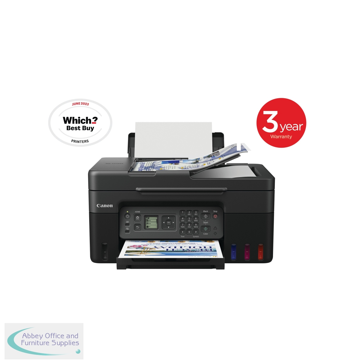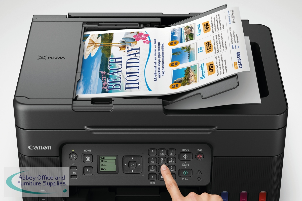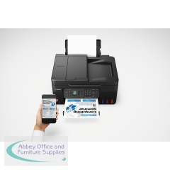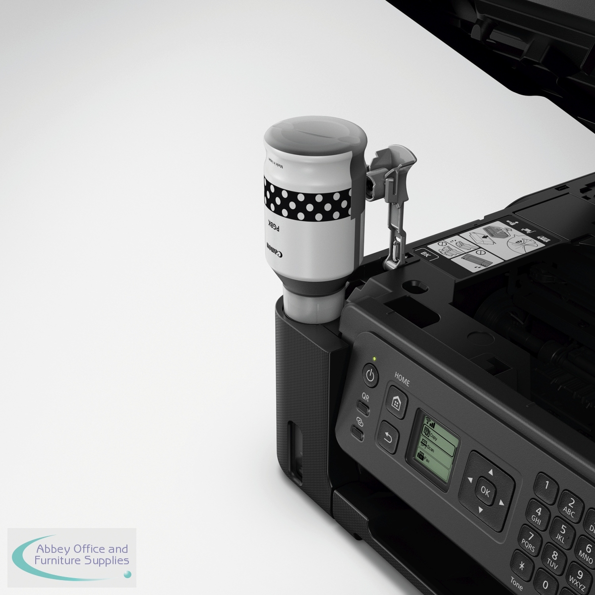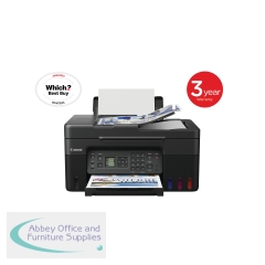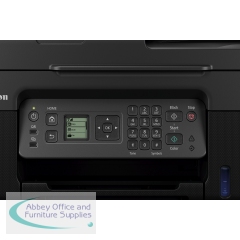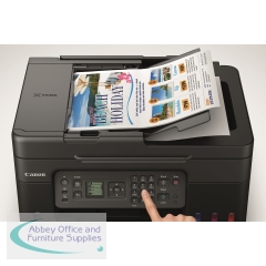 The Canon Pixma printer G4570 4 in 1 A4 is a refillable ink tank printer, this all in one device can print, copy, scan and fax. With an automatic document feeder capable of up to 35 sheets (1-sided). Print resolution up to 4800 x 1200 dpi. The G4570 is a refillable ink tank printer and has 2 FINE print heads (Black and Colour). With a mono print speed of approximately 11 ipm and colour print speed of approximately 6.0 ipm. Standard interface: Hi-Speed USB (USB B Port), Wi-Fi; Wireless printing requires a working network with wireless 802.11bgna or ac capability, operating at 2.4GHz. Comes with a rear paper tray, with a 100 sheet capacity. The G4570 has a CIS flatbed photo and document scanner, with 600 x 1200 dpi (optical) resolution, with a maximum document size of A4LTR. The copying specications allow for 3 levels of copy quality; Economy, Standard and High and 9 intensity levels. Capable of up to 99 muliple copies. Copy zoom of between 25 and 400 percent. The Super G3Colour fax functionality is capable of up to 300 x 300 dpi (mono) and 200 x 200 dpi (colour). Holds up to 50 pages in the memory. Group dial of up to 19 locations.