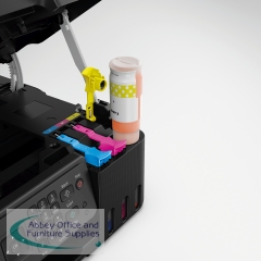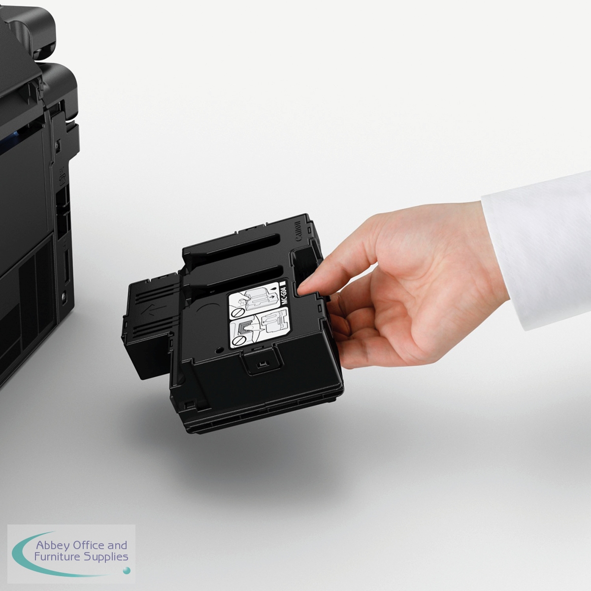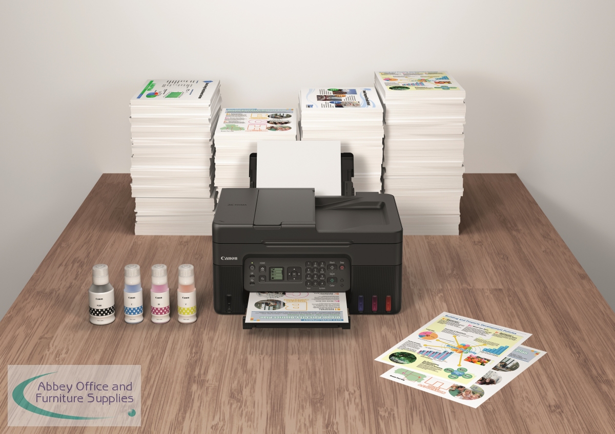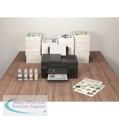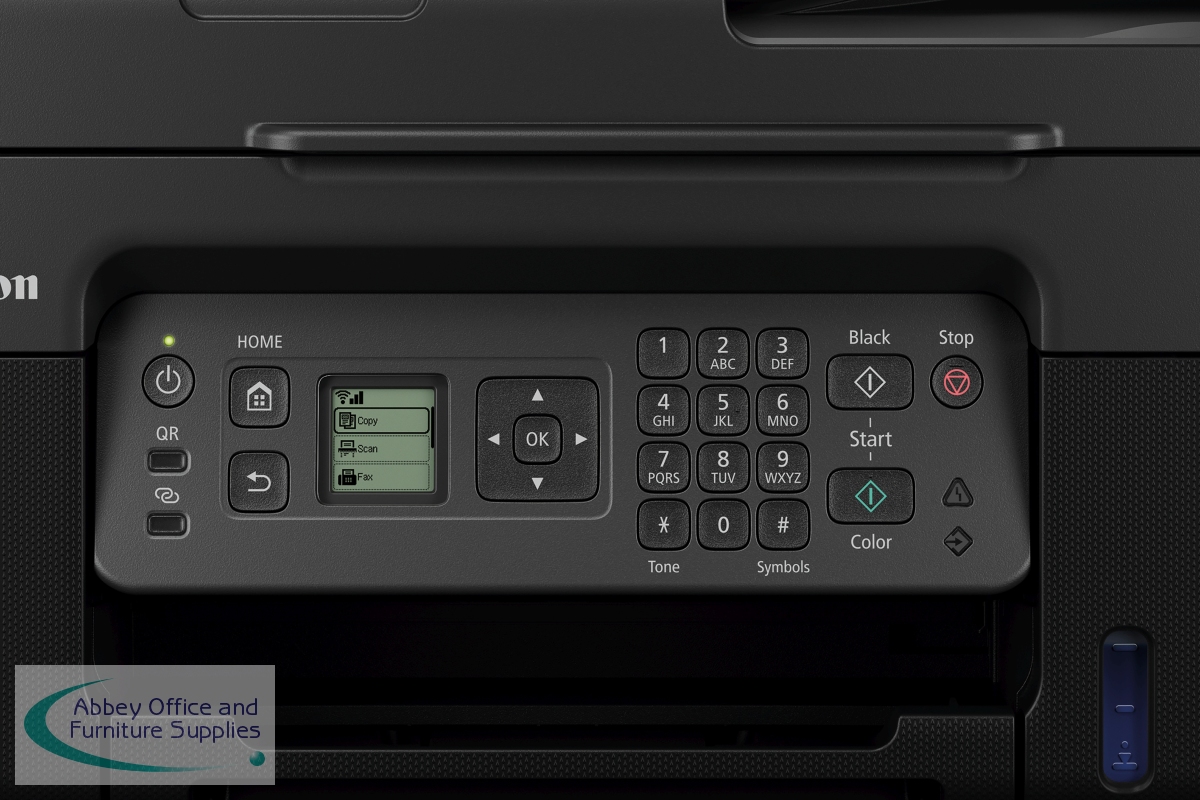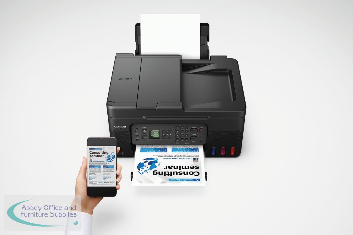 The Canon Pixma printer G4570 4 in 1 A4 is a refillable ink tank printer, this all in one device can print, copy, scan and fax. With an automatic document feeder capable of up to 35 sheets (1-sided). Print resolution up to 4800 x 1200 dpi. The G4570 is a refillable ink tank printer and has 2 FINE print heads (Black and Colour). With a mono print speed of approximately 11 ipm and colour print speed of approximately 6.0 ipm. Standard interface: Hi-Speed USB (USB B Port), Wi-Fi; Wireless printing requires a working network with wireless 802.11bgna or ac capability, operating at 2.4GHz. Comes with a rear paper tray, with a 100 sheet capacity. The G4570 has a CIS flatbed photo and document scanner, with 600 x 1200 dpi (optical) resolution, with a maximum document size of A4LTR. The copying specications allow for 3 levels of copy quality; Economy, Standard and High and 9 intensity levels. Capable of up to 99 muliple copies. Copy zoom of between 25 and 400 percent. The Super G3Colour fax functionality is capable of up to 300 x 300 dpi (mono) and 200 x 200 dpi (colour). Holds up to 50 pages in the memory. Group dial of up to 19 locations.