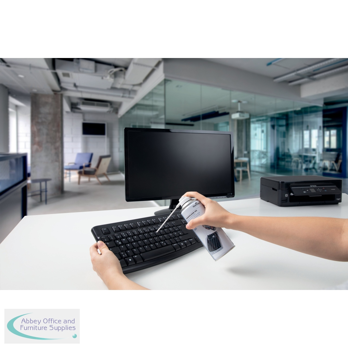 Durable Powerclean 350 Compressed Air Duster removes dirt from sensitive equipment and hard to reach areas such as keyboard, printers, laptops, etc. The air duster helps to improve hygiene in the workplace and reduce sick days. The compressed gas does not leave a residue meaning the air duster can be used without damaging the device that is being cleaned. Each air duster is supplied with a spray tube for those hard to reach areas.