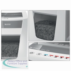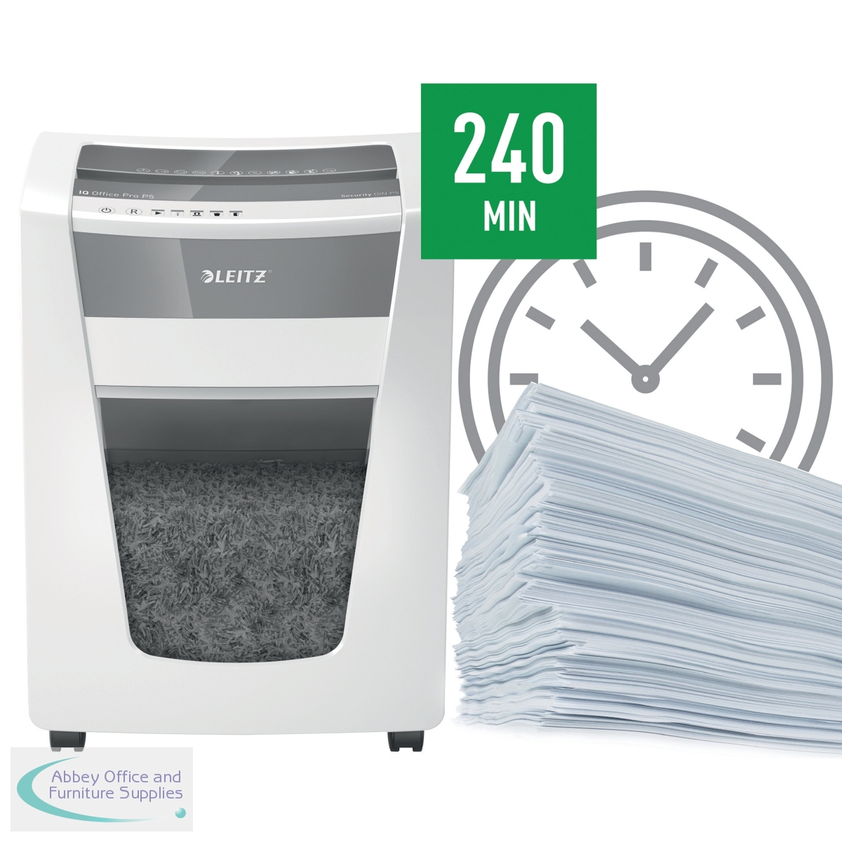 The Leitz IQ Office Pro Micro-Cut Shredder offers the ultimate in style, performance and security. This model features high performance Security DIN P-5 cut for high security and waste compaction. Perfect secure shredding every time, ideal for office use. Higher security and excellent performance with this anti jam, quiet and long running shredder. The Leitz IQ shreds up to 15 sheets of A4 paper (80gsm) into 2x15mm micro cut pieces allowing more in the generous 30L bin with simple operation using touch controls. Shred for longer with a class leading 4 hour run time, for a completely uninterrupted shredding experience.