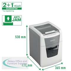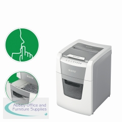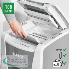 The Leitz IQ Autofeed Cross-Cut is a fully automatic paper shredder with unique clean emptying feature. So intelligent it quietly works on its own, just insert your stack of papers (including staples and paper clips), close the lid and get on with your day. Ideal for small office use. Confidential security and excellent performance with this anti jam, quiet and long running (20 min) autofeed shredder. The Leitz IQ automatically shreds up to 100 sheets of A4 paper (80gsm) into P-4 (4x30mm) cross cut pieces in one go into the generous 34L bin. Simple operation using touch controls.