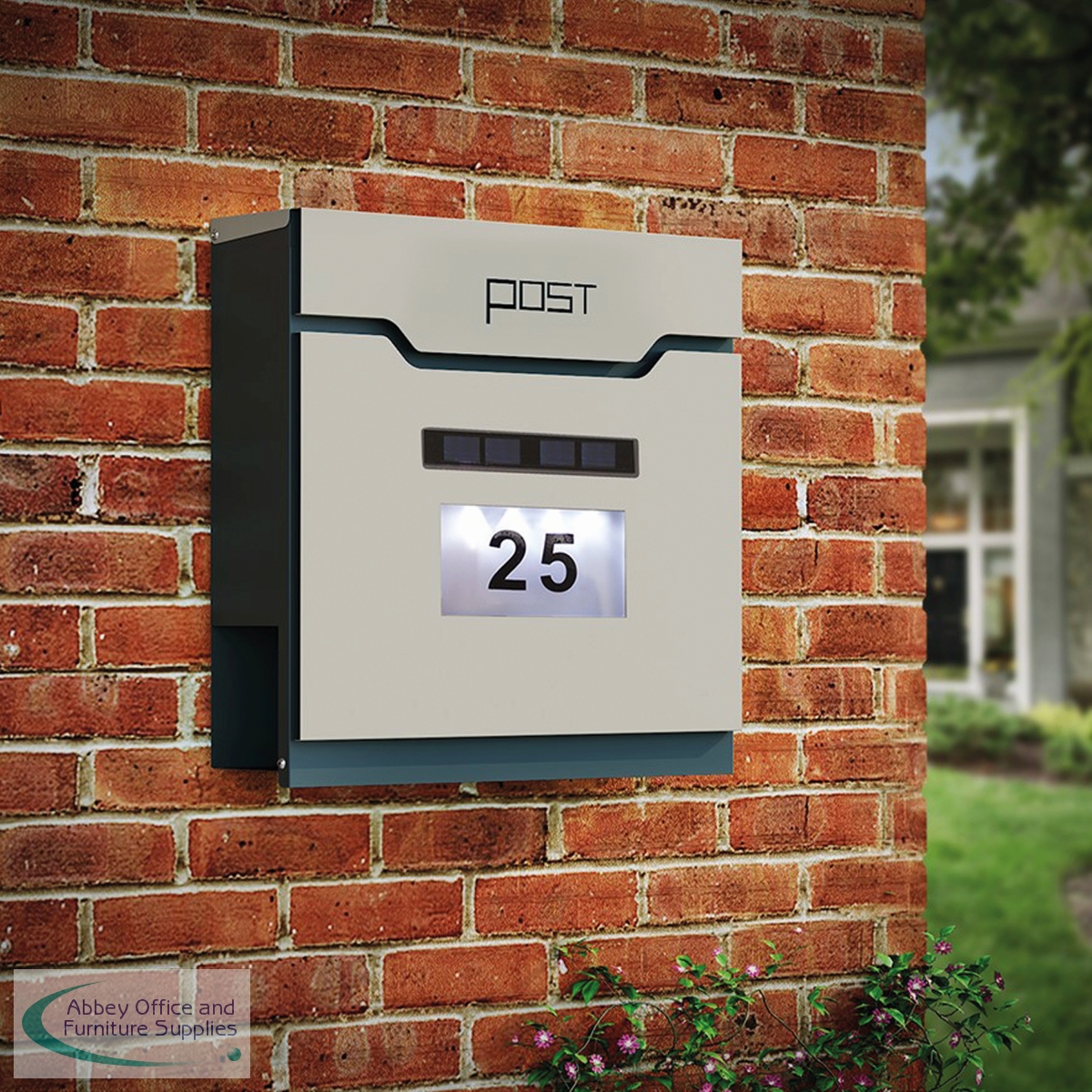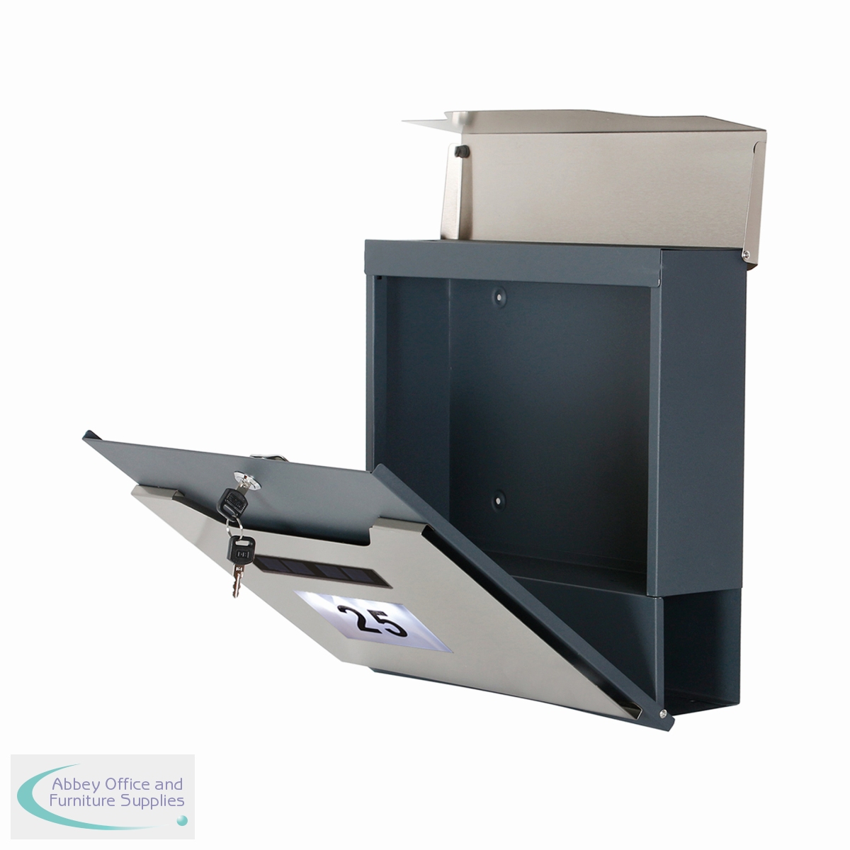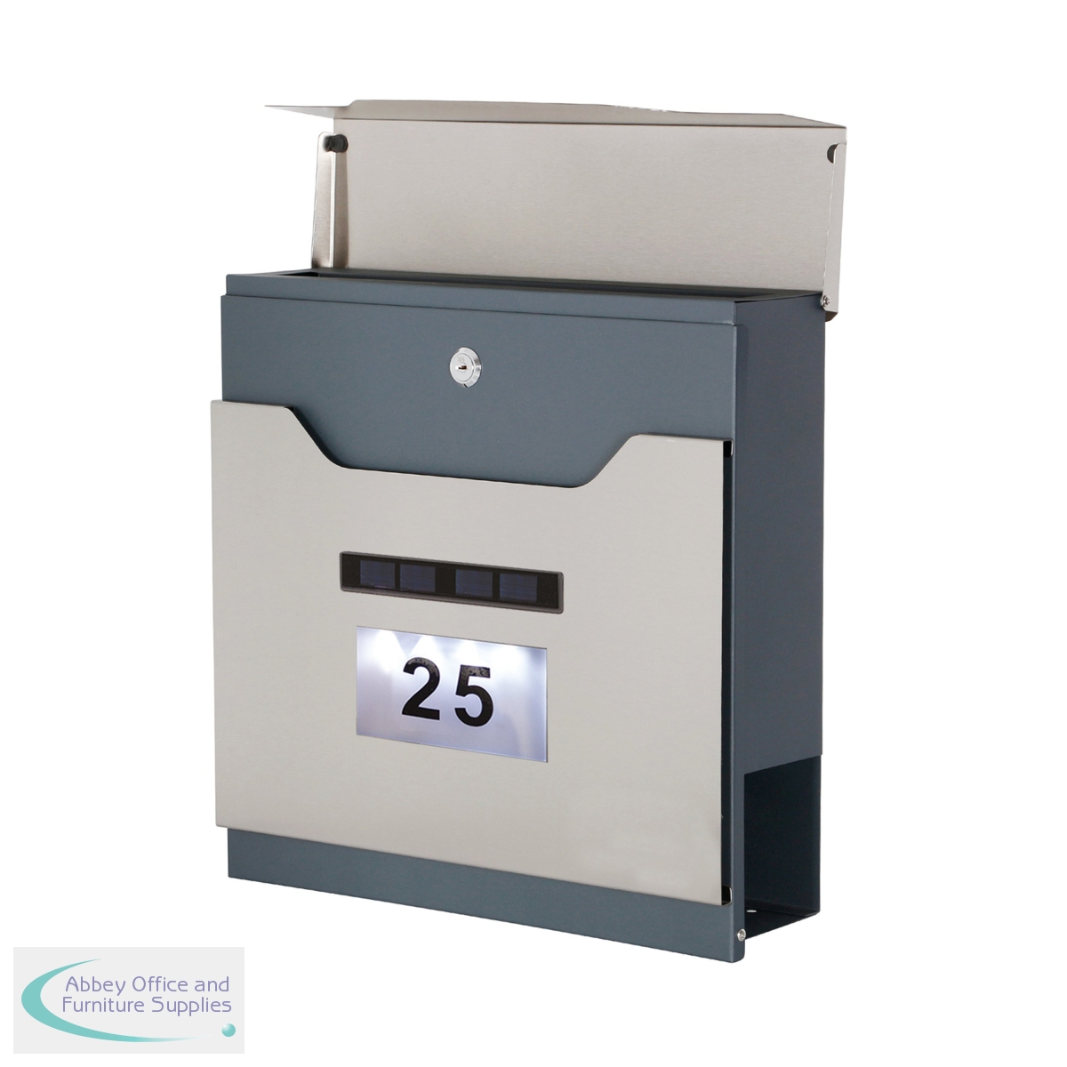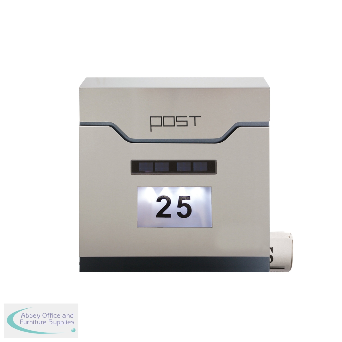 THE Phoenix Estilo MB0125KS top-loading letter box is a secure, ultra stylish letter box made from high quality stainless steel. Durable, attractive and ideal for the modern home. A heavy duty construction allows for a lengthy product lifespan. A zinc galvanised coating prevents oxidisation and gives it a corrosion resistant, weather-proof and rust proof finish. Newspaper holder at the base. Light up panel that illuminates your house number at night (numbers provided), powered by solar energy with battery backup. Fitted with a high quality key-lock and supplied with 3 keys. Suitable for wall mounting with pre-drilled holes and fixings supplied. The letter slot measures 335mm wide and 35mm high.