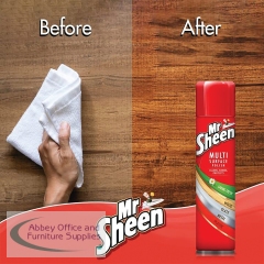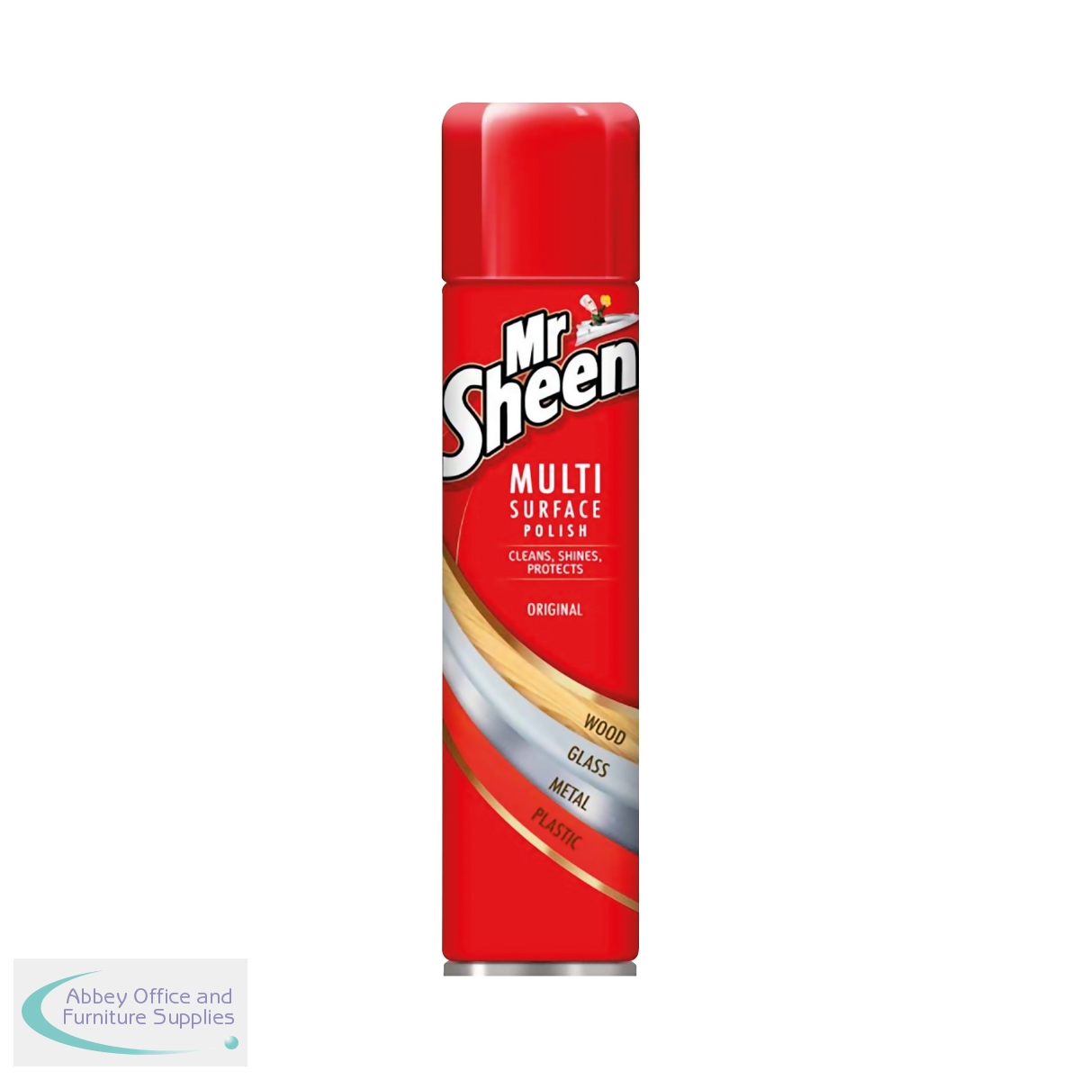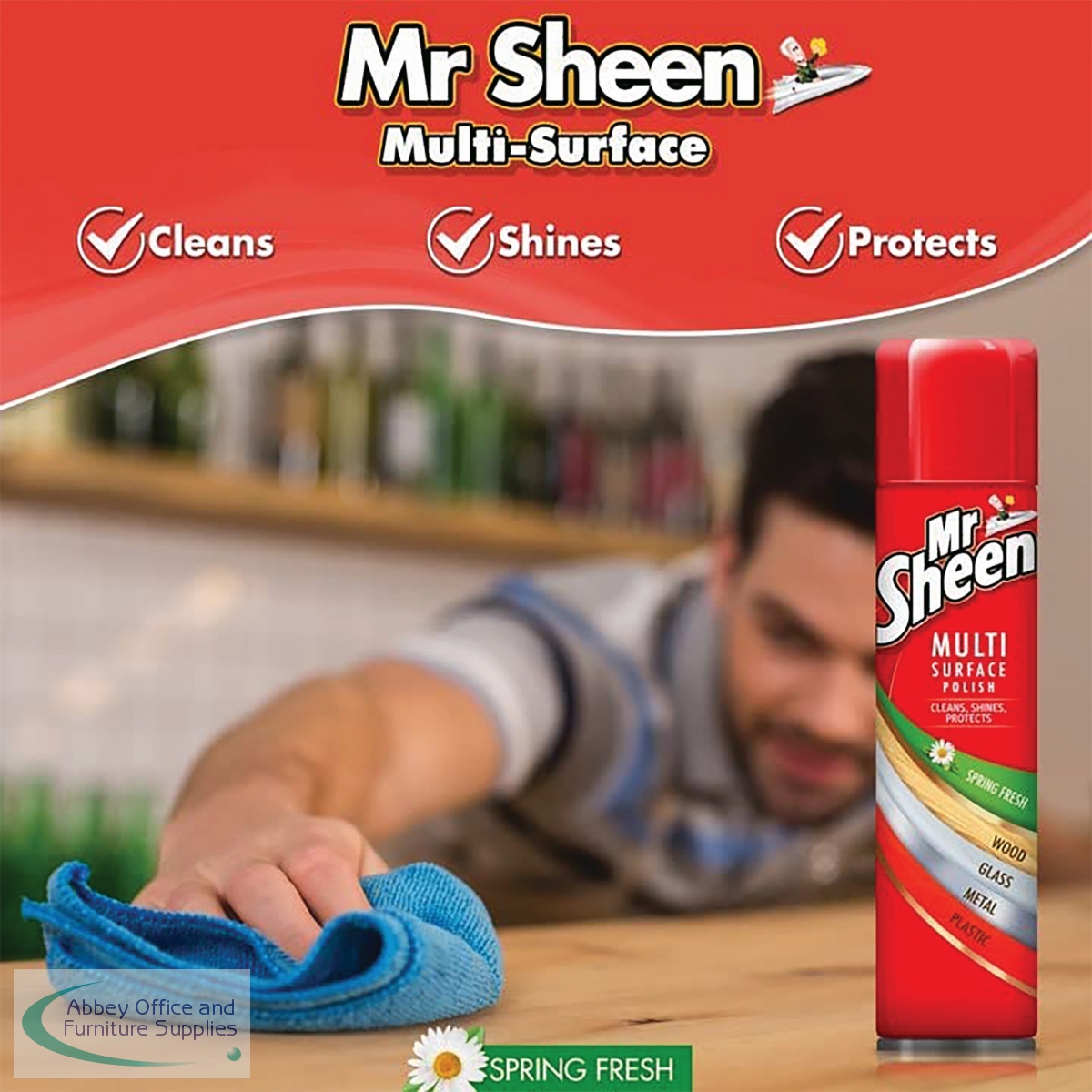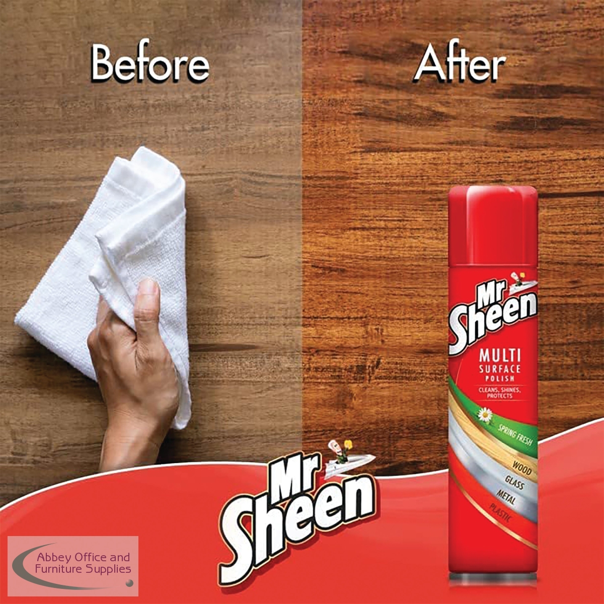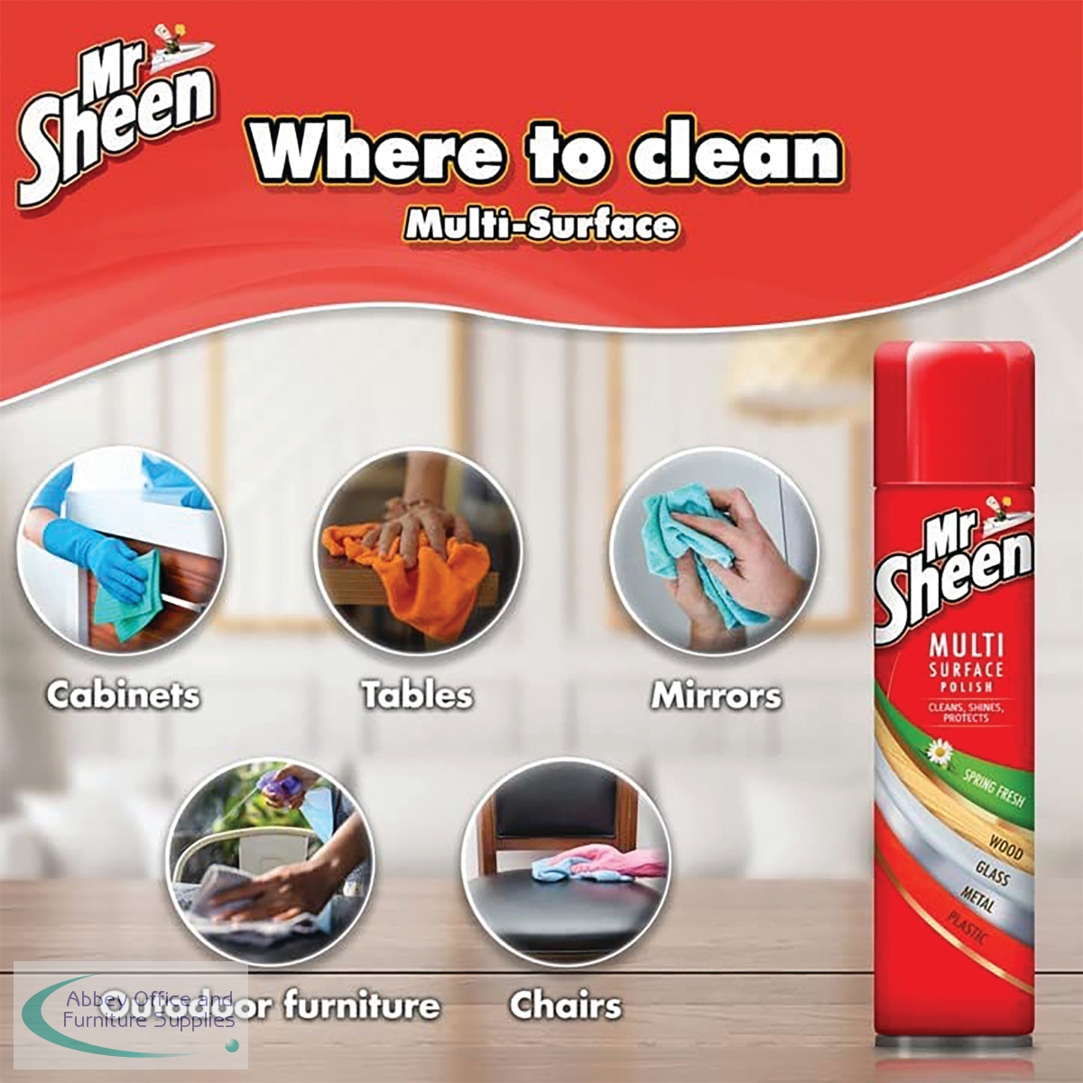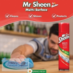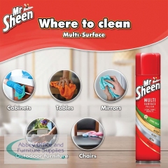 Mr Sheen multi-surface aerosol polish spray cleans, shines and eliminates dust on a variety of surfaces including metal, wood, glass, and melamine. 250ml.