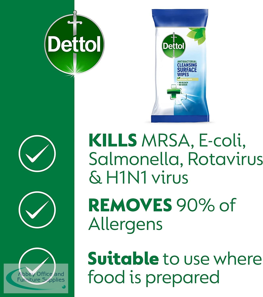 Made from biodegradable fibres, these Dettol Antibacterial cleansing surface wipes are tough on germs and allergens, killing 99.9% of bacteria and viruses. These 100% plant based wipes are free from bleach and odour. There are 126 large wipes per pack.