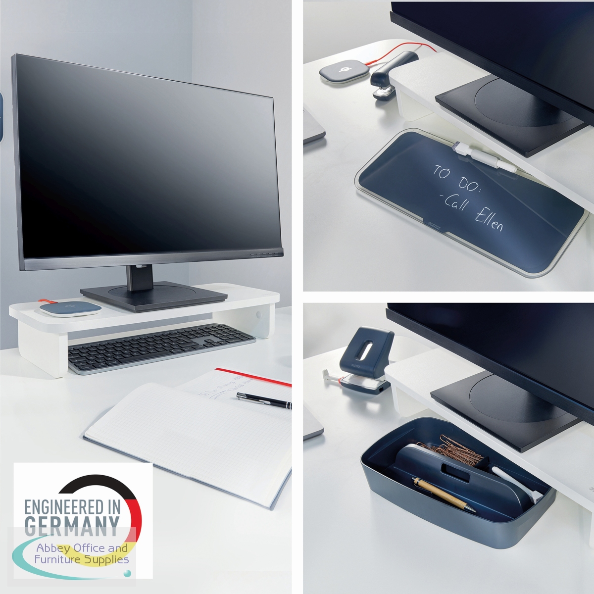 The Leitz Ergo Monitor Stand raises the screen of your monitor to increase your viewing comfort and help improve posture. Using a monitor riser will also keep your desk organised and clutter free by providing storage for your keyboard and other daily essentials. With it's minimalist design and matt finish, this stylish monitor stand will improve health and wellbeing by effortlessly creating the perfect active working set-up.