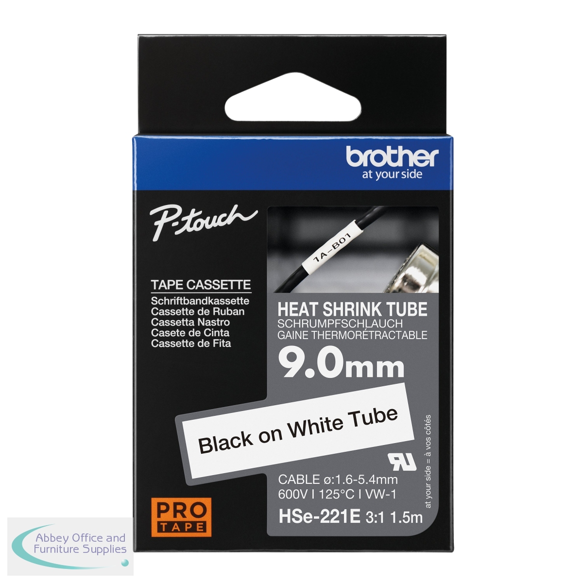 The Brother 9mm black on white Hse-221E tape cassette has been designed specifically for the marking and identifying of cables, fibres and wires with an outside diameter of 1.6mm to 5.4mm. The non-adhesive tape is printed, the printed tube is opened up and passed over a cable, or terminating connector and heated with a heat gun, the tube shrinks down, gripping the cable tightly. No adhesive is needed, ensuring that even in warm environments the heat shrink tube will not unpeel from the cable. For use with Brother P-Touch labelmakers. Quick and easy to install. For crisp, sharp and easily readable labels. 1.5m length.