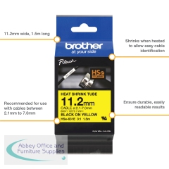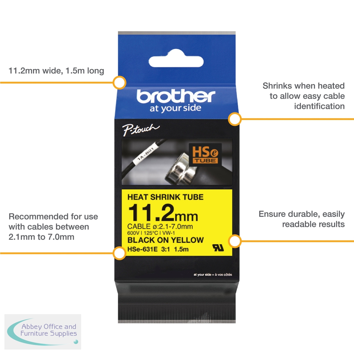 The Brother 11.2mm black on yellow HSe-631E tape cassette has been designed specifically for the marking and identifying of cables, fibres and wires with an outside diameter of 2.1mm to 7.0mm. The non-adhesive tape is printed, the printed tube is opened up and passed over a cable, or terminating connector and heated with a heat gun, the tube shrinks down, gripping the cable tightly. No adhesive is needed, ensuring that even in warm environments the heat shrink tube will not unpeel from the cable. For use with Brother P-Touch labelmakers. Quick and easy to install. For crisp, sharp and easily readable labels. 1.5m length.