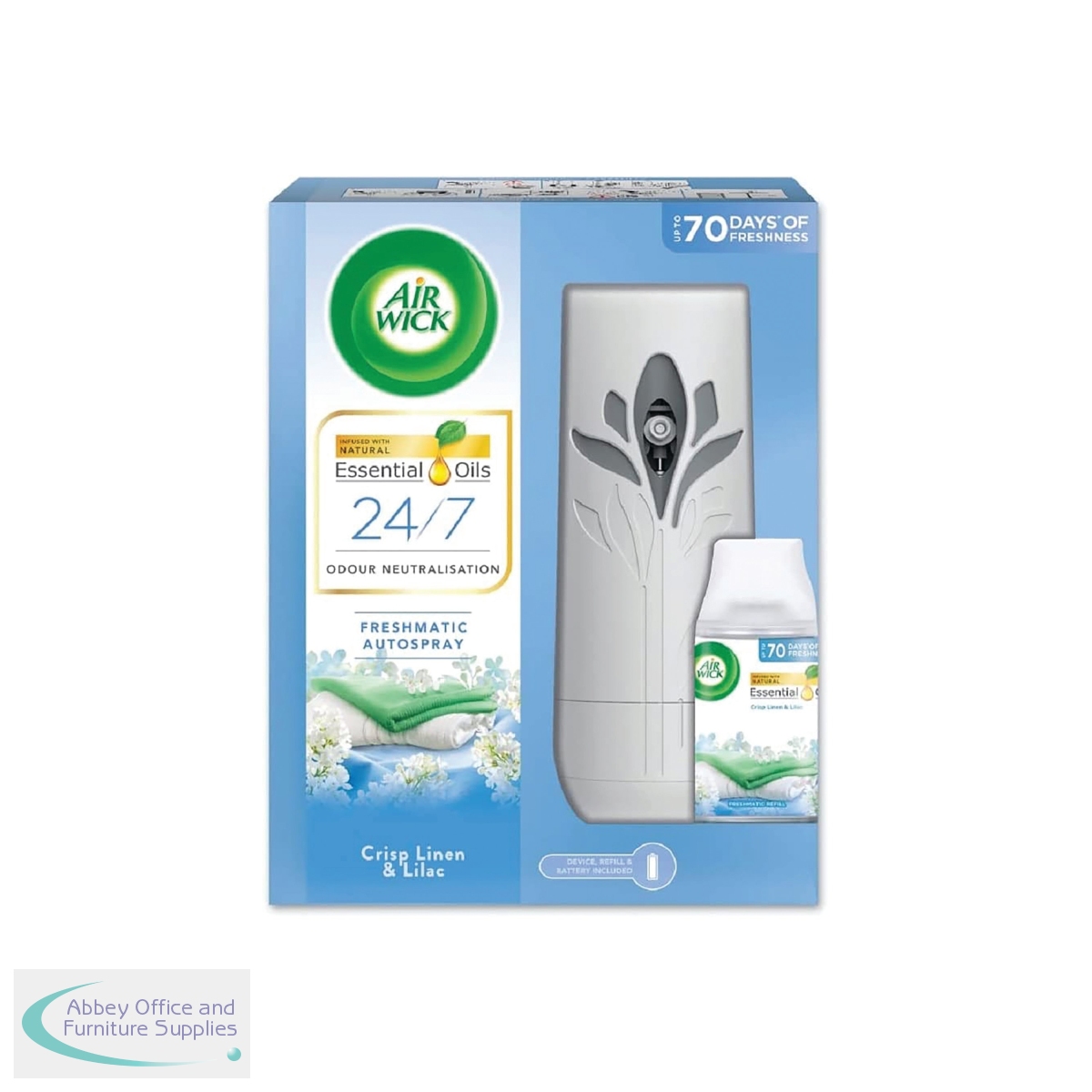 One spritz of Air Wick Freshmatic Max Air Freshener in crisp linen and lilac is enough to fill a room. Bring to life the crisp, cool elegance of fine linen, accented with the fragrant touch of wild lilac. Air Wick Freshmatic Automatic Sprays release bursts of continuous fresh fragrance so your environment always smells welcoming. Just set the air freshener to your preferred fragrance intensity setting and enjoy while the crisp linen and lilac refill neutralises odours. Fragrances your home, office or bathroom for up to 70 days per refill when on low setting. Ideal for any room, at home, in the office or work environment.