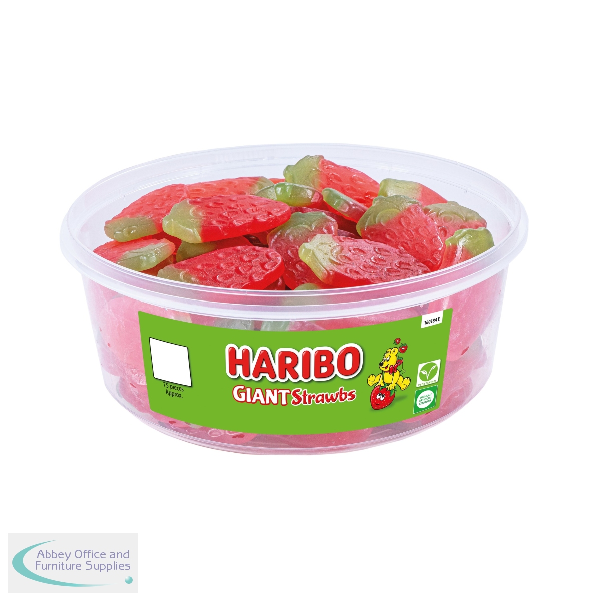 Share some fun and tasty snacks with this tub of Haribo Giant Strawbs. Giant in size and in flavour, these strawberry shaped sweets taste of delicious strawberry with a chewy texture. Suitable for vegetarians and a firm family favourite. This large tub contains approximately 825g Giant Strawbs, ideal for special occasions, celebrations and more.