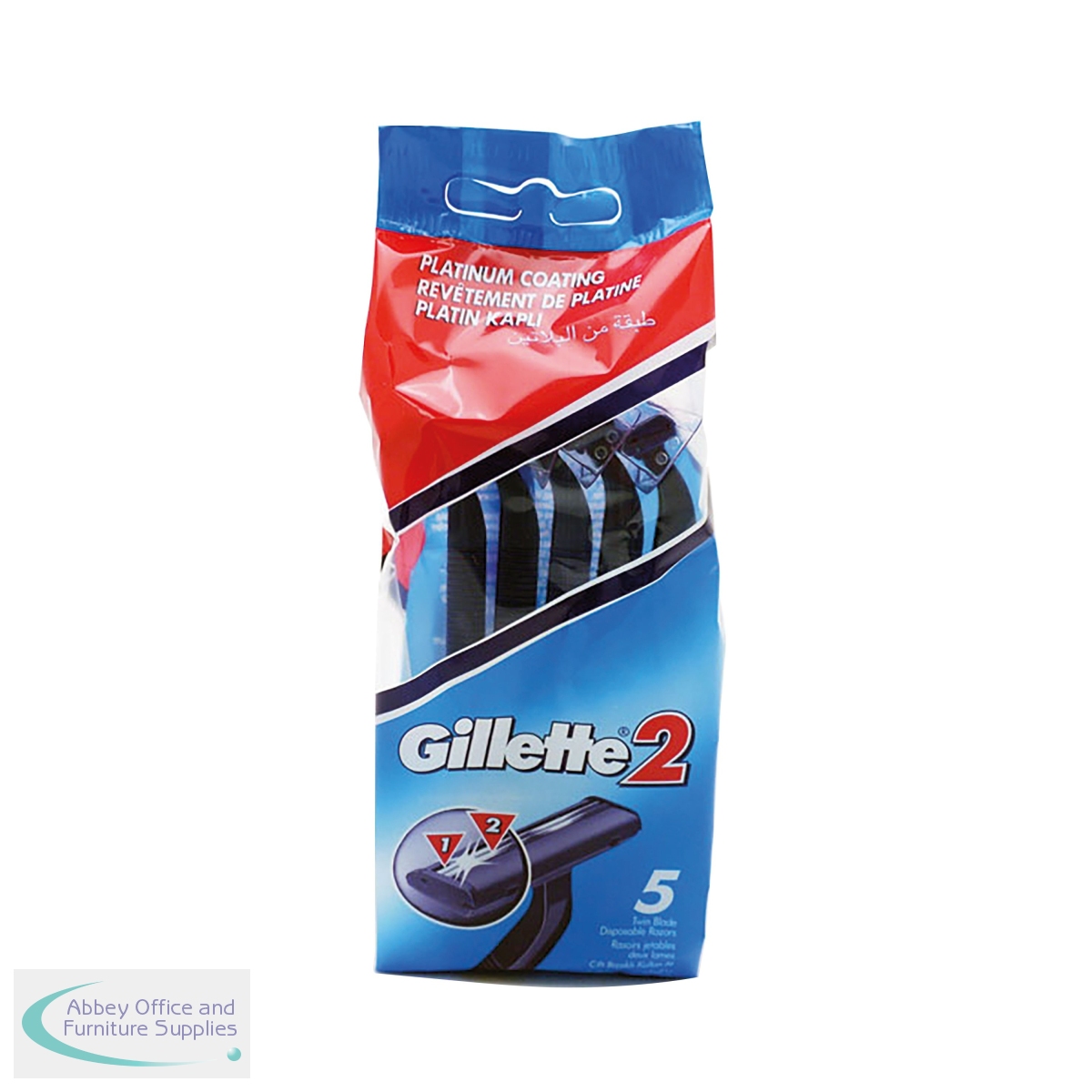 Gillette 2 twin blade disposable razors have been specifically designed to deliver a close shave with minimum effort and maximum comfort. Designed with a lightweight handle. Platinum coating. Each pouch pack contains 5 twin blade razors. 24 packs supplied.